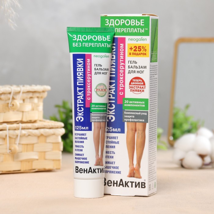Эффективное средство на основе натуральных биоактивных компонентов. Способствует устранению усталости и тяжести в ногах, уменьшению вечерних отеков. Оказывает комплексное положительное действие. Способствует активизации функции венозных клапанов, микро циркуляции и лимфооттока. Снижает риск возникновения трофических изменений кожи (сухость, шелушение, истонченность). Питает, смягчает, увлажняет и освежает кожу ног. Эффективность и безопасность геля-бальзама для ног обеспечена синергизмом активных природных компонентов. Медицинская пиявка способствуют образованию новых капилляров, в результате чего улучшается микроциркуляция крови и разгружается венозная система. Ферменты пиявки ускоряют заживление трофических язв, улучшают состояние кожи. Троксерутин обеспечивает комплексное решение проблемы варикоза, укрепляет вены и повышает их тонус, снижает ломкость капилляров, препятствует отечности и улучшает эстетический вид ног.