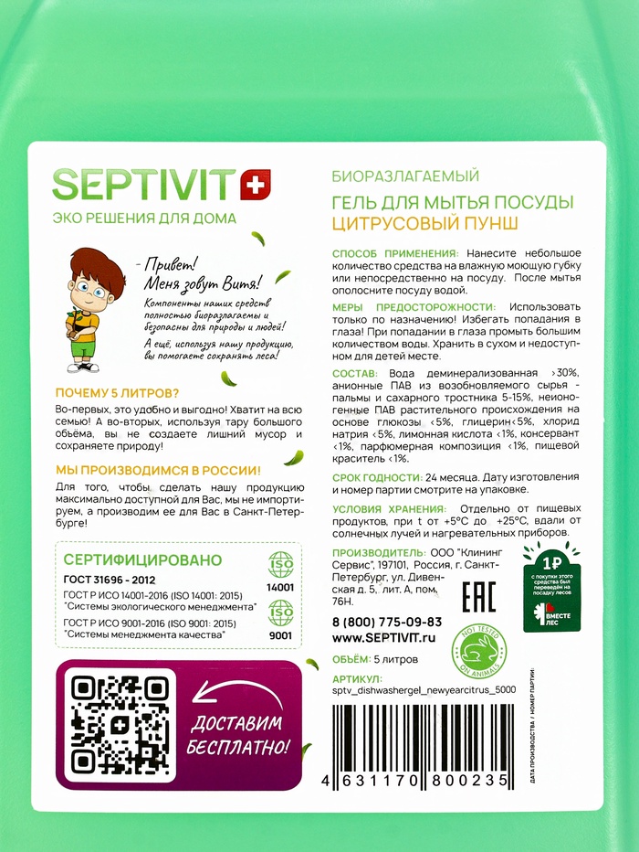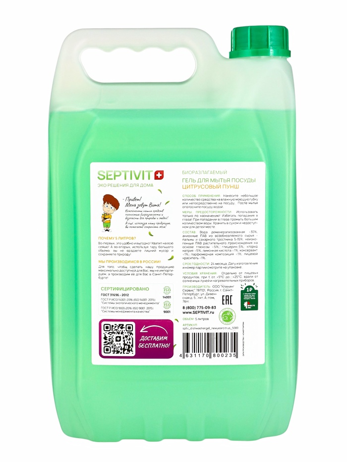 Габариты: 17 x 12,5 x 30 Доставка: Платная Страна: Россия В боксе: 4 шт Состав: См. на упаковке Материалы: см. на упаковке Фасовка: по 1 шт Индивидуальная упаковка: Без упаковки Сертификат: Не подлежит сертификации Вес, г/Объём, мл: 5000 Гель для посуды SEPTIVIT "Цитрусовый пунш" – это профессиональное средство для эффективного удаления жира и загрязнений с любой посуды. Формула с повышенной концентрацией активных компонентов и натуральными цитрусовыми экстрактами обеспечивает быстрое отмывание даже сложных загрязнений, оставляя после себя свежий, бодрящий аромат апельсина и лимона. Основные свойства: ✔ Мощное обезжиривание – справляется с засохшим жиром и нагаром ✔ Безопасный состав – не содержит хлора и фосфатов ✔ Экономичный расход – концентрированная формула ✔ Приятный цитрусовый аромат – нейтрализует запахи пищи ✔ Подходит для ручной и машинной мойки (если производитель техники допускает использование гелей) Способ применения: Нанесите несколько капель геля на губку или прямо на посуду Вспеньте и тщательно потрите Смойте большим количеством воды Меры предосторожности: Хранить в недоступном для детей месте Избегать попадания в глаза (при случайном контакте промыть водой) Комментарии к товару