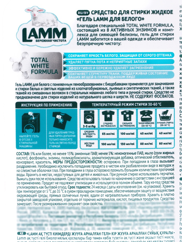 Применение Гель подходит для машинной и ручной стирки. Рекомендуется дозировать средство согласно инструкции на упаковке в зависимости от степени загрязнения и объёма белья. Для кого LAMM для белого создан для людей, которые ценят яркость, чистоту и долговечность своих вещей. Это идеальный выбор для поддержания белого белья, одежды и текстиля дома. Комментарии к товару
