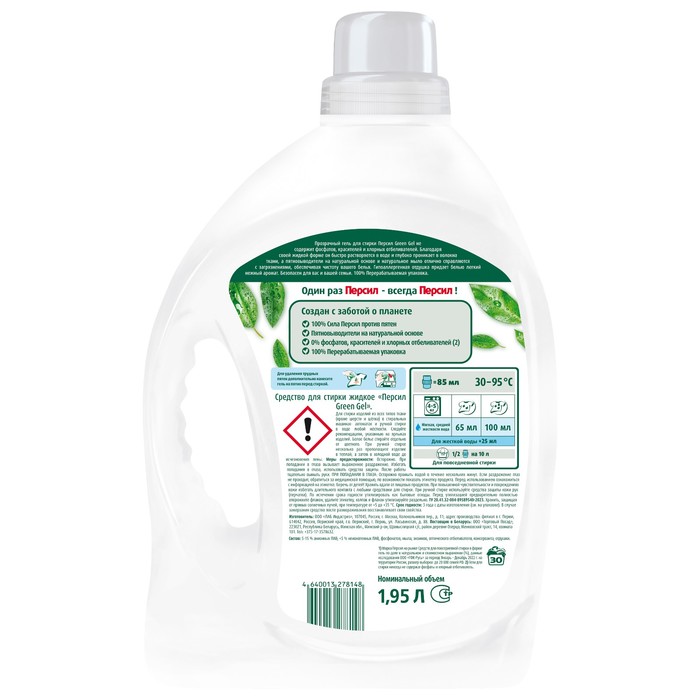Габариты: 9 x 19 x 33 Страна: Россия В боксе: 6 шт Состав: См. на упаковке Материалы: см. на упаковке Фасовка: по 1 шт Индивидуальная упаковка: Без упаковки Сертификат: СТР Объём, л: 1,95 Назначение: Для цветных тканей Вид стирки: Для всех видов стирки Темпер. ограничение НЕ НИЖЕ ℃: 0 Особенности средства: Без фосфатов, Без хлора и фосфора Гель для стирки Персил Green Gel: -Не содержит фосфатов, красителей и хлорных отбеливателей -Пятновыводители на натуральной основе -Гипоаллергенная отдушка -Подходит для стики изделий из всех типов ткани (кроме шерсти и шелка) -Обеспечивает щадящее отношение к ткани во время стирки -Растворяется даже в холодной воде и при стирке на кротких циклах -Не оставляет разводов и полностью выполаскивается водой -Не пылит, не просыпается и не накапливается в кювете стиральной машины -100% перерабатываемая упаковка Способ применения: Следуйте рекомендациям, указанным на ярлыках изделий. Для удаления трудных пятен дополнительно нанесите гель на пятно перед стиркой. При использовании геля соблюдайте необходимую дозировку, написанную на задней стороне этикетки. Загрузите вещи в барабан стиральной машины и залейте гель в отсек средств для стирки. При сильном загрязнении колпачок с гелем можно поставить непосредственно в барабан стиральной машины. При ручной стирке несколько раз прополощите изделие в теплой, а затем в холодной воде. Осторожно. При попадании в глаза вызывает выраженное раздражение глаз. Избегать попадания в глаза, использовать средства защиты. После работы тщательно вымыть руки. При попадании в глаза: осторожно промыть глаза водой в течении нескольких минут. Если раздражение глаз не проходит, обратиться за медицинской помощью, по возможности показать этикетку продукта. Беречь от детей! Хранить вдали от пищевых продуктов. При повышенной чувствительности и повреждениях кожи избегать контакта с любыми средствами для стирки. При ручной стирке используйте перчатки. Состав:5-15 % анионных ПАВ; < 5 % неионогенных ПАВ, фосфонатов, мыла, энзимов, оптического отбеливателя, консерванта, отдушки Комментарии к товару