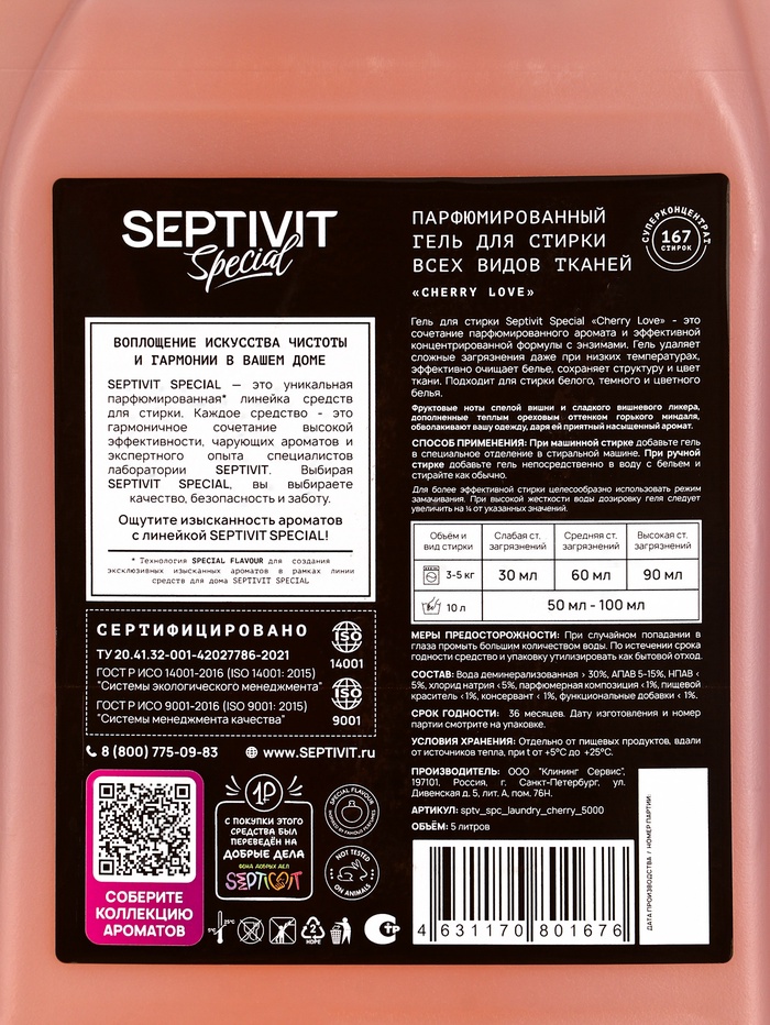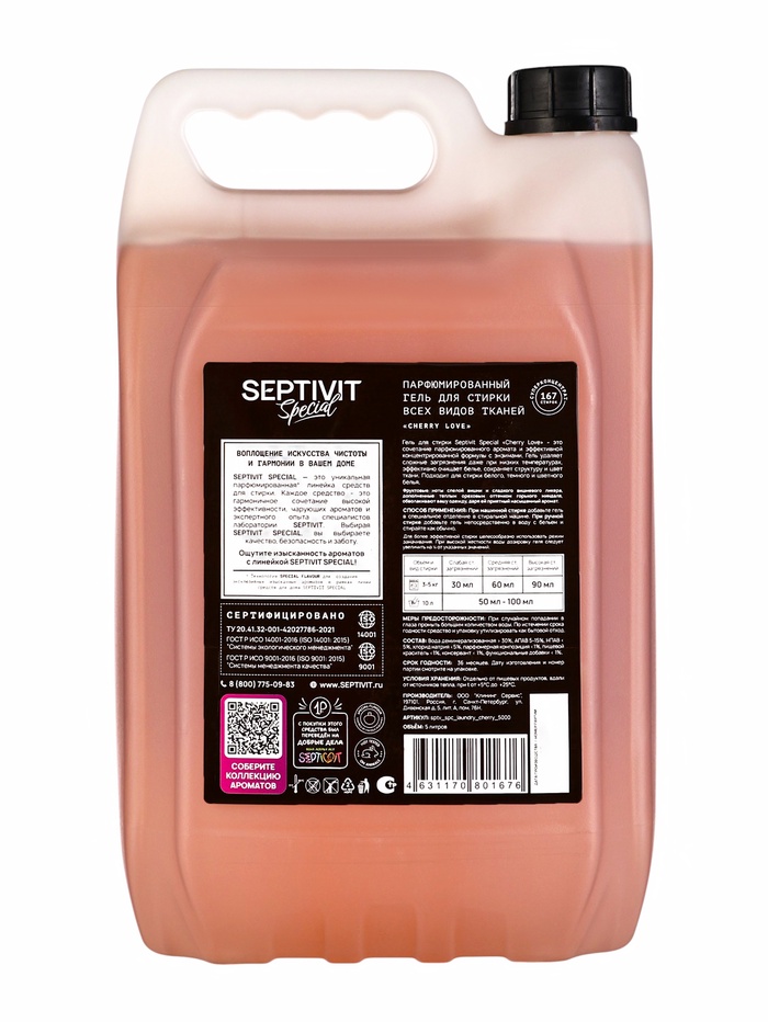 Габариты: 17 x 12,5 x 30 Доставка: Платная Страна: Россия В боксе: 1 шт Состав: См. на упаковке Материалы: см. на упаковке Фасовка: по 1 шт Индивидуальная упаковка: Без упаковки Сертификат: СТР Объём, л: 5 Вес, г/Объём, мл: 5000 Форма выпуска: Гель Назначение: Для всех видов тканей Вид стирки: Для всех видов стирки Гель для стирки Septivit Special «Cherry Love», 5 л — это нежное и эффективное средство для ухода за вашей одеждой с соблазнительным ароматом спелой вишни. Формула геля бережно очищает ткани, удаляя загрязнения и сохраняя яркость цвета и мягкость ткани даже после множества стирок. Идеален для всех видов тканей, включая деликатные и цветные изделия. Преимущества: Мягкое и глубокое очищение; Сохранение яркости и структуры ткани; Приятный, свежий аромат вишни; Подходит для машинной и ручной стирки; Концентрированная формула для экономного расхода. Способ применения: Для машинной стирки: Добавьте 50 мл геля в отделение для моющего средства или прямо в барабан стиральной машины. Выберите подходящую программу согласно типу ткани и степени загрязнения. Для ручной стирки: Растворите 30 мл геля в 5 литрах теплой воды. Замочите вещи на 10–15 минут, затем аккуратно постирайте и тщательно прополощите. Комментарии к товару