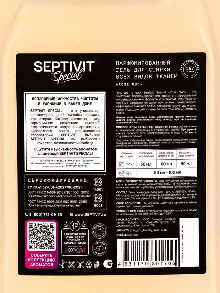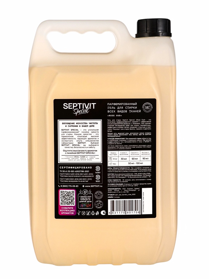 Габариты: 17 x 12,5 x 30 Доставка: Платная Страна: Россия В боксе: 1 шт Состав: См. на упаковке Материалы: см. на упаковке Фасовка: по 1 шт Индивидуальная упаковка: Без упаковки Сертификат: СТР Объём, л: 5 Вес, г/Объём, мл: 5000 Форма выпуска: Гель Назначение: Для всех видов тканей Вид стирки: Для всех видов стирки Гель для стирки Septivit Special «Rose Oud», 5 л — это изысканное средство для ухода за вашей одеждой с утонченным ароматом розы и уда. Специальная формула геля эффективно удаляет загрязнения, при этом бережно сохраняет мягкость и насыщенность цвета тканей. Идеален для ежедневной стирки всех типов тканей, включая деликатные и цветные. Преимущества: Глубокое и деликатное очищение; Сохраняет цвет и структуру ткани; Роскошный, стойкий аромат розы и уда; Подходит для машинной и ручной стирки; Концентрированная формула с экономичным расходом. Способ применения: Для машинной стирки: Добавьте 50 мл геля в отделение для моющего средства или прямо в барабан стиральной машины. Выберите программу в соответствии с типом ткани и степенью загрязнения. Для ручной стирки: Растворите 30 мл геля в 5 литрах теплой воды. Замочите одежду на 10–15 минут, затем аккуратно постирайте и тщательно прополощите. Комментарии к товару