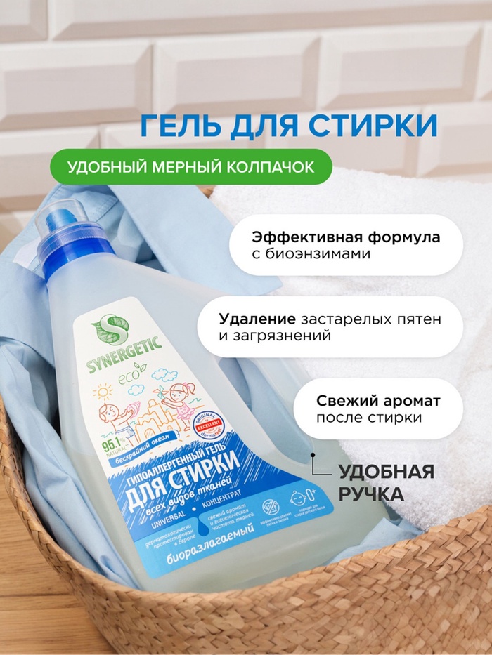 Биоразлагаемый концентрированный гель для стирки всех видов тканей SYNERGETIC UNIVERSAL с ароматом "Бескрайний океан" обеспечивает бережное и эффективное очищение тканей, гигиеническую чистоту одежды и устраняет неприятные запахи.