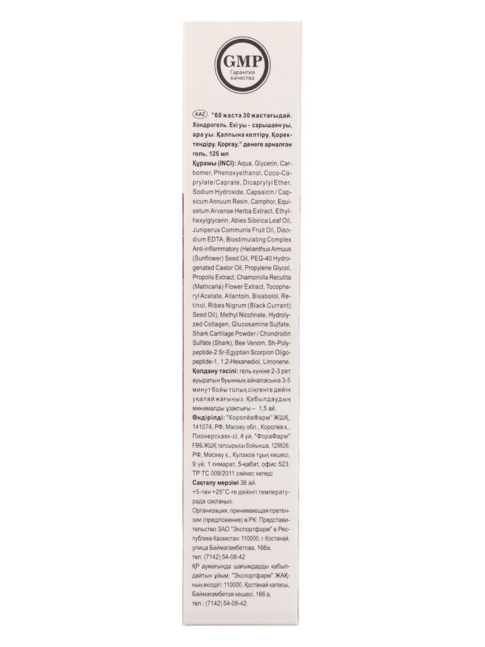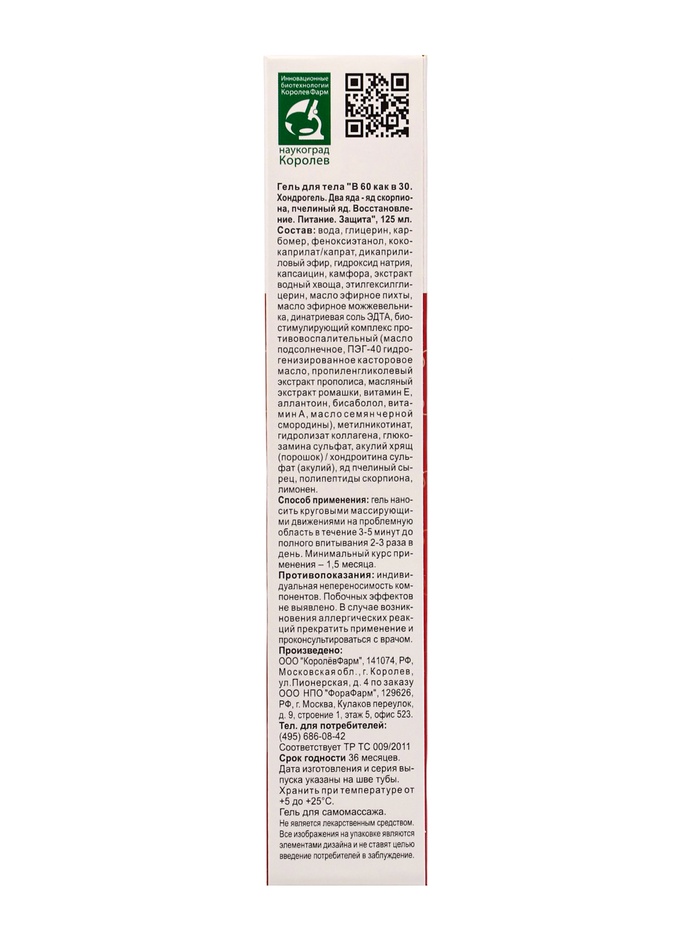 Габариты: 3,8 x 5,7 x 20 Страна: Россия В боксе: 40 шт Состав: См. на упаковке Материалы: см. на упаковке Фасовка: по 1 шт Индивидуальная упаковка: Цветная коробка Сертификат: ЕАС Вес, г/Объём, мл: 125 Показания: Болезни суставов, Боль в суставах (артралгия) Компоненты: Хвощ, Можжевельник Действие: Обезболивающие Инновационное средство на основе хондропротекторов, коллагена и биостимулирующего комплекса витаминов группы B. Высокая концентрация активных компонентов и особая биодоступность действующих веществ обеспечивают высокую эффективность крема: снижают риск развития нарушений функционального состояния, ускоряют естественные процессы регенерации, улучшают питание, тормозят негативные возрастные процессы. Яд скорпиона обладает выраженным противовоспалительным и обезболивающим эффектом. Крем на основе яда скорпиона способствует быстрому восстановлению при ревматизме, артрите, остеохондрозе, радикулите, воспалении седалищного нерва, ноющих болях в суставах, мышечных судорогах, вывихах и растяжениях мышц. Крем для тела активизирует механизмы регенерации хрящевой ткани и содействует комплексному оздоровлению опорно-двигательного аппарата. Пчелиный яд обладает выраженным противовоспалительным, разогревающим, обезболивающим, бактерицидным, активизирует кровоток, улучшает обмен веществ в суставе и питание суставных тканей. Повышая проницаемость кожных покровов, способствует глубокому проникновению лечебных компонентов в проблемную область. Комментарии к товару