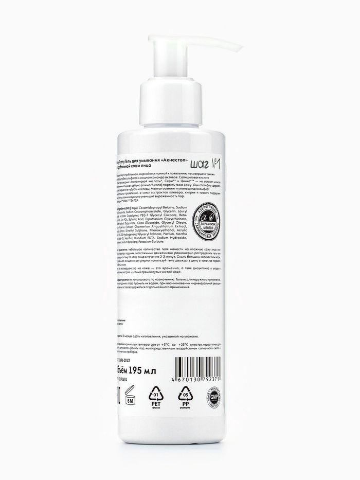 Aqua, Cocamidopropyl Betaine, Sodium Lauroyl Sarcosinate, Sodium Cocoamphoacetate, Glycerin, Lauryl Glucoside, Acrylates Copolymer, PEG-7 Glyceryl Cocoate, Beta-Cyclodextrin, Zinс PCA, Salicylic Acid, Dipotassium Glycyrrhizinate, Potassium Azeloyl Diglycinate, Coco-Glucoside, Glyceryl Oleate, Trifolium Рraténse Extraсt, Chamerion Angustifolium Extraсt, Filipéndula Extraсt, Dimethyl Sulphone, Phenoxyethanol, Acrylic Polymer, PEG-200 Hydrogenated Glyceryl Palmate, Parfum, Mentha Arvensis Leaf Oil, Menthol, Disodium EDTA, Sodium Hydroxide, Chlorphenesin, Sodium Benzoate, Potassium Sorbate.