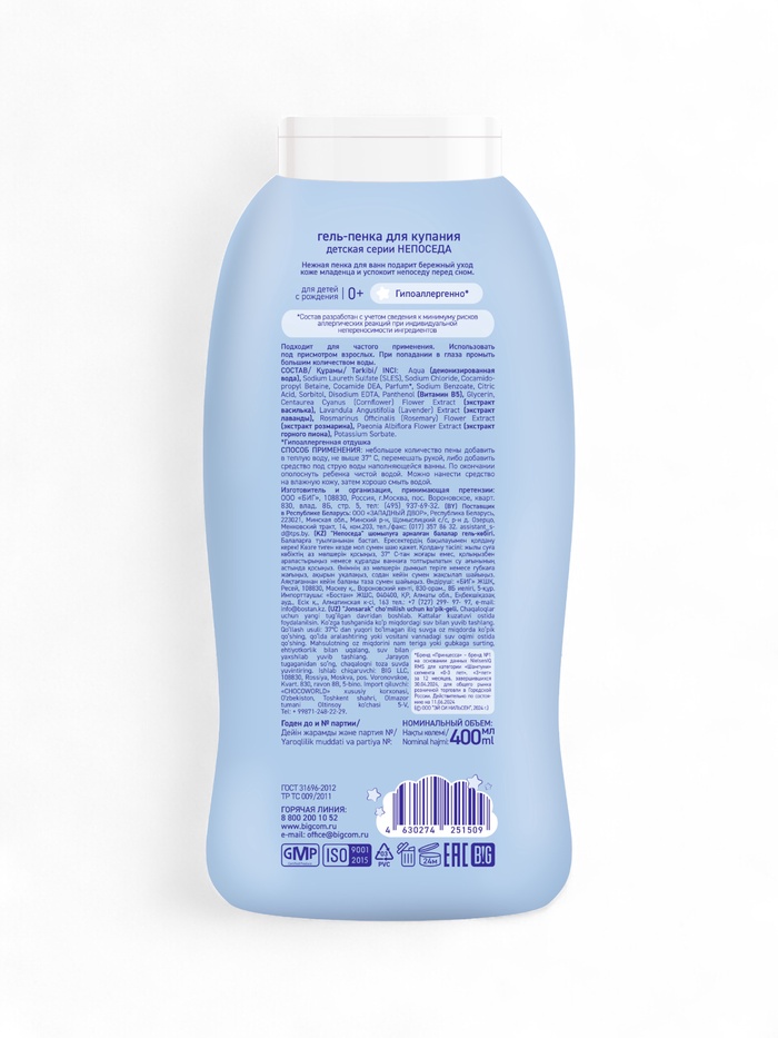 Габариты: 19 x 8,5 x 4 Страна: Россия В боксе: 8 шт Состав: См. на упаковке Материалы: см. на упаковке Фасовка: по 1 шт Индивидуальная упаковка: Без упаковки Сертификат: ЕАС Возраст: От 0 месяцев Объём, мл: 400 Аромат: Нейтральный Гель-пенка с горным пионом Непоседа создан специально для ухода за нежной кожей новорожденных. Не сожержит SLS, парабены, метилы, красители и аллергены. Нежный гель подходит как для бережного очищения кожи, так и для создания мягкой пены для принятия вечерней ванны. Благодаря Д-пантенолу и комплексу натуральных экстрактов пиона и розмарина, гель-пенка не только бережно очищает нежную кожу, но так же обеспечивает увлажнение и питание, способствует снятию ощущения сухости и раздражений. А нежный гипоаллергенный аромат успокоит кроху перед сном. Состав разработан с учетом сведения к минимуму рисков аллергических реакций при индивидуальной непереносимости ингредиентов. Способ применения: нанести на губку или ладонь, вспенить и равномерно распределить, затем тщательно смыть водой. Можно использовать в качестве пены для ванны. Подходит для ежедневного применения. Аромат: нейтральный аромат детской косметики. Состав: Aqua (деионизированная вода), Sodium Laureth Sulfate (SLES), Sodium Chloride, Cocamidopropyl Betaine, Cocamide DEA, Parfum, Sodium Benzoate, Citric Acid, Sorbitol, Disodium EDTA, Panthenol (Витамин В5), Glycerin, Centaurea Cyanus (Cornflower) Flower Extract (экстракт василька), Lavandula Angustifolia (Lavender) Extract (экстракт лаванды), Rosmarinus Officinalis (Rosemary) Flower Extract (экстракт розмарина), Paeonia Albiflora Flower Extract (экстракт горного пиона), Potassium Sorbate. Условия хранения: Условия хранения: Хранить в сухом прохладном месте при температуре от 0 до +25 градусов. Цельсия и относительной влажности воздуха не более 70%. Комментарии к товару
