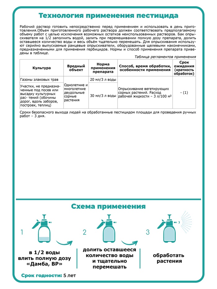 Действие «Дамба, ВР» – средство для борьбы с широким спектром двудольных сорняков на газонах и участках, не предназначенных под посев культурных растений. Дамба, ВР применяется по активно вегетирующим сорнякам в интервале температур от +10 °С до +28 °С. Максимально рекомендованная норма расхода препарата используется при высокой засоренности и по переросшим сорнякам. Опрыскивание производится в утренние или вечерние часы в безветренную погоду, чтобы препарат не попал на соседние культуры. Не проводить обработку при обильной росе или если в ближайшие 4 часа ожидается дождь. Результат
