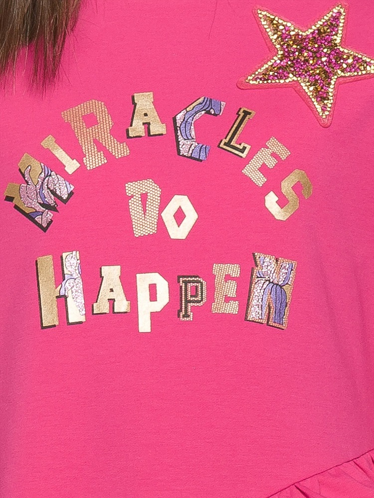 Платье для девочек из футера А силуэта. Аккуратный втачной рукав, небольшая горловина. Фишка декоративный асимметричный рельеф необычной округлой формы по переду и по спинке до низа изделия. В рельеф вставлен волан. Rubber принт с золотым металликом и глиттером. Надпись Чудеса случаются. Вуаля.