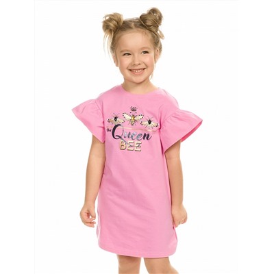 Платье для девочек. Новая форма рукава. Платье умеренного объёма А образного силуэта со спущенным плечом с воланом, по низу которого разрез, и прочным мягким принтом с разноцветным глиттером, золотом и стразами, перевод Королева пчёл.