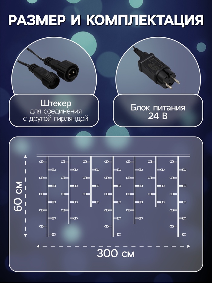 Габариты: 17 x 9 x 10 Страна: Китай В боксе: 50 шт Состав: Металл, пластик, светодиоды Материалы: металл, пластик, светодиоды Фасовка: по 1 шт Индивидуальная упаковка: Цветная картонная коробка Сертификат: ЕАС Цвет нити гирлянды: Тёмный Цвет свечения: Белый Применение: Уличное Вид лампы: Светодиодная Материал нити: ПВХ Тип подключения: Комплект для подключения Вид гирлянды: Бахрома Вид светодиода: DIP Количество жил: 2 Количество ламп: 160 Серия: SPEC Режим работы: Мерцание Наличие блока питания: Да Размер, м: 3 х 0.6 Насадки: Нет Ширина, м: 3 Высота, м: 0,6 Количество режимов: 1 Гарантийный срок, мес.: 12 Степень защиты: IP44 Температурный режим: от -30 до +35 °С Тип питания: 24 В Фиксированная цена: Да
