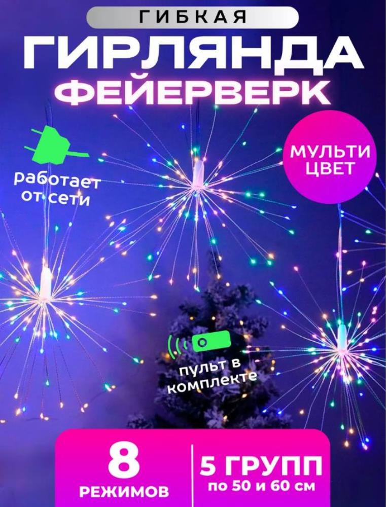 Гирлянда Фейерверк 3 метра, 220V, цветное свечение Гирлянда салют отлично создает атмосферу новогоднего волшебства в вашем доме. Достигает 3 метров, что позволяет украсить более обширное пространство. 8 режимов мигания, а работает она от сети. На проводе расположены 5 групп по 50 и 60 см. по 100 светодиодов, формирующих эффект светящихся капель росы. Благодаря гибкой конструкции, можно формировать пучки по желанию – в виде фейерверка или с изгибами, напоминающими одуванчики. Подойдет для украшения офиса, комнаты и окон (можно прикрепить к шторе). Безопасна в использовании - лампочки не нагреваются, а все материалы качественные. Комментарии к товару
