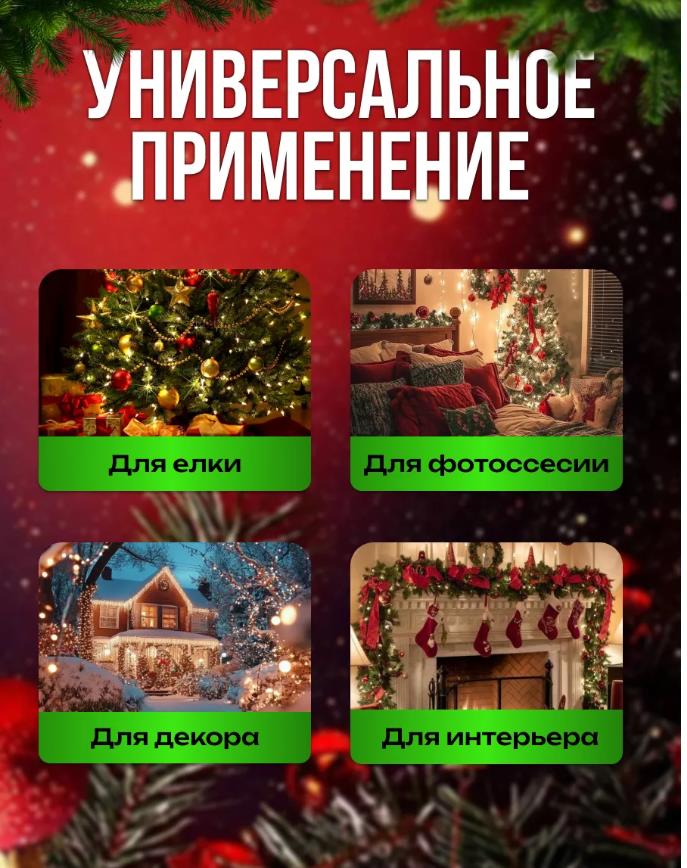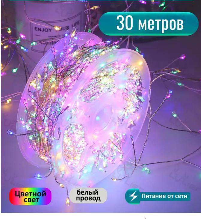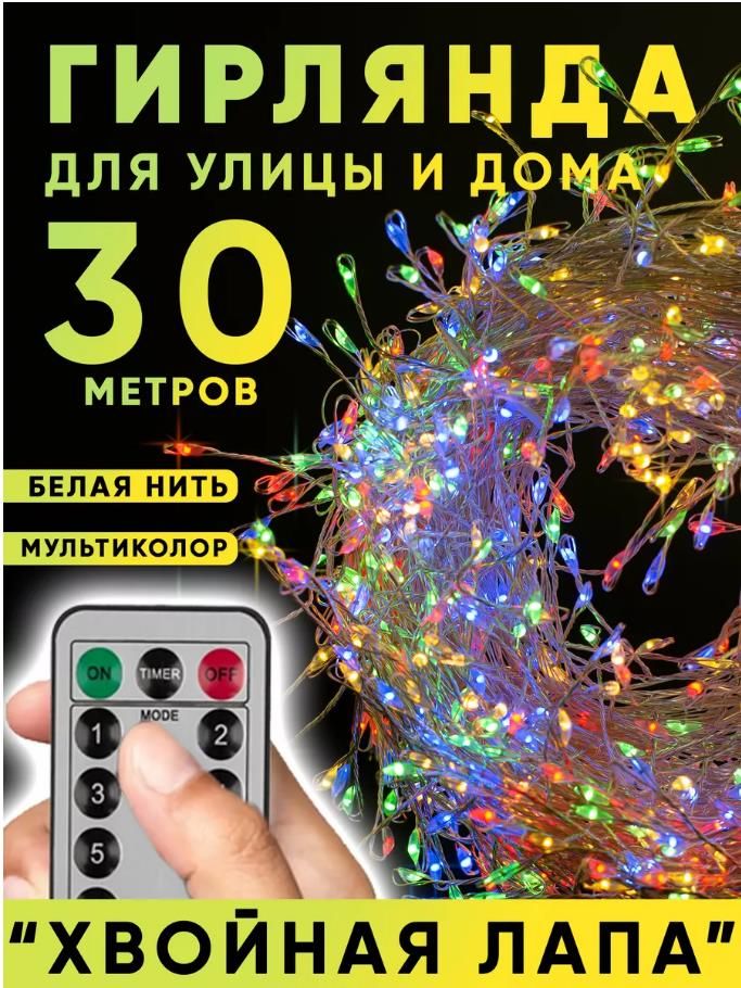 Гирлянда нить МИШУРА, хвойная лапа, (провод БЕЛЫЙ) с пультом, свечение цветное Гирлянда хвойная лапа с эффектом роса придает комнате новогодний шарм. Идеальное украшение для создания праздничной атмосферы, она наполняет пространство неповторимыми огоньками. Светодиодный светящийся элемент делает её современным атрибутом любого праздника. Украсьте елочку этим изделием, добавив ей яркости и блеска. Форма напоминает фейерверк, взрывающийся на небе тысячами разноцветных искр. Такой эффект создает впечатление настоящего волшебства в любой комнате. Новогодняя гирлянда обладает удивительным дизайном, напоминающим конский хвост. Этот декоративный элемент создает атмосферную иллюминацию как внутри помещения, так и снаружи. Используйте её на балконе для освещения окна или декора вашего жилого пространства. Её уникальные элементы представляют собой сочетание росы и сеть лампочек, создавая магические огоньки среди веток вашей зеленой красавицы. Они придают ёлке праздничный вид и превращают ее в центр внимания на Новый год. Светодиодные компоненты позволяют использовать это новогоднее украшение много раз подряд благодаря надежности и долговечности диодов. Экономичное энергопотребление делает эту гирлянду практичным выбором для долгих зимних вечеров. Легкость конструкции позволяет разместить её даже на миниатюрной елке или добавить высоко на верхушку дерева дополнительные светящиеся акценты. Гибкостью отличается она также в способах установки: можно уложить вокруг шероховатых поверхностей или обвить пышные хвойные ветки. Мишура нежно окутывает лапу ели, придавая ей романтический блеск волшебства новогодней ночи. Эффект будет таким же захватывающим под открытым небом на заснеженном дереве или под крышей уютного дома рядом с камином. Изделие хорошо работает как самостоятельная декоративная композиция или часть большего ансамбля украшений для Нового года. Можно комбинировать её с другими украшениями для усиления эффекта фейерверка через разнообразие света и формы. Комментарии к товару