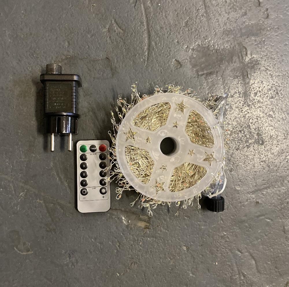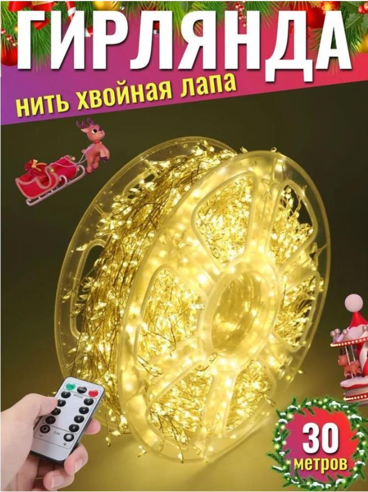 Гирлянда нить МИШУРА, хвойная лапа, (провод БЕЛЫЙ) с ПУЛЬТОМ, свечение теплое - желтое