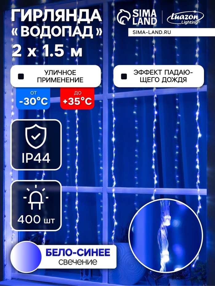 Габариты: 18 x 10 x 11 Страна: Китай В боксе: 20 шт Состав: Металл, пластик Материалы: металл, пластик Фасовка: по 1 шт Индивидуальная упаковка: Цветная картонная коробка Габариты товара: 10 см × 20 см × 20 см Сертификат: ЕАС Цвет нити гирлянды: Прозрачный Цвет свечения: Бело-синий Применение: Уличное Вид лампы: Светодиодная Материал нити: ПВХ Тип подключения: С контроллером Вид гирлянды: Водопад Вид светодиода: DIP Количество ламп: 400 Серия: ECO Режим работы: Задаётся контроллером Размер, м: 2 х 1.5 Насадки: Нет Вид насадки: Без насадок Ширина, м: 2 Высота, м: 1,5 Количество режимов: 8 Гарантийный срок, мес.: 12 Тематика праздника: Новый год Степень защиты: IP44 Температурный режим: от -30 до +35 °С Тип питания: От сети 220 В ![]() Комплектация