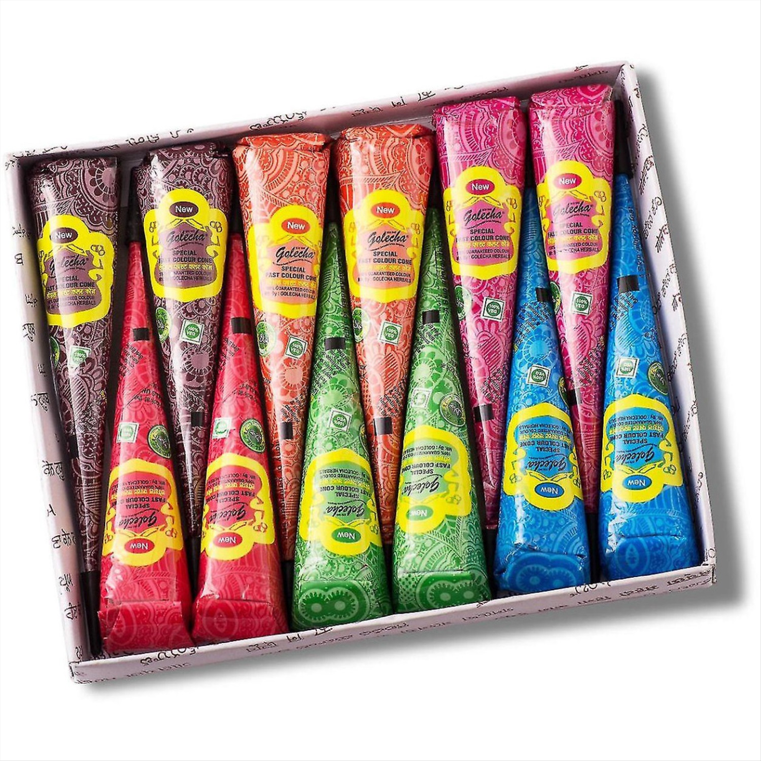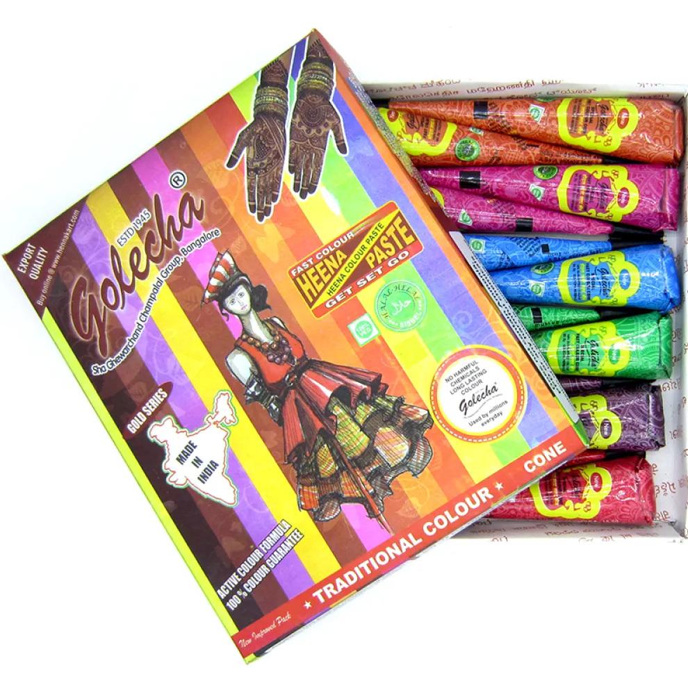 Набор разноцветной хны Golecha (12 конусов в упаковке) — это средство для нанесения рисунков на кожу, которое подходит для мехенди и временных татуировок. Включает 6 разных цветов для создания восточных узоров, орнаментов и оригинальных татуировок.