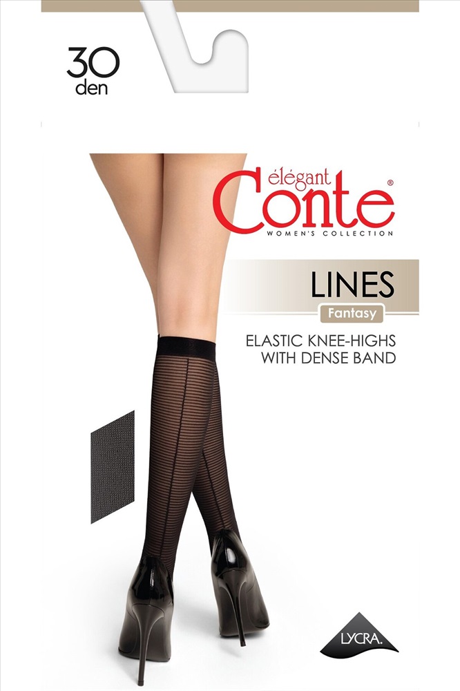 Страна производства: Беларусь Тонкие фантазийные женские гольфы 30 ден c рисунком «горизонтальные полоски с имитацией шва», без пятки, с эластичным бортом.