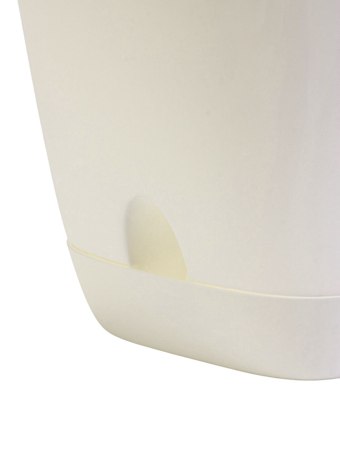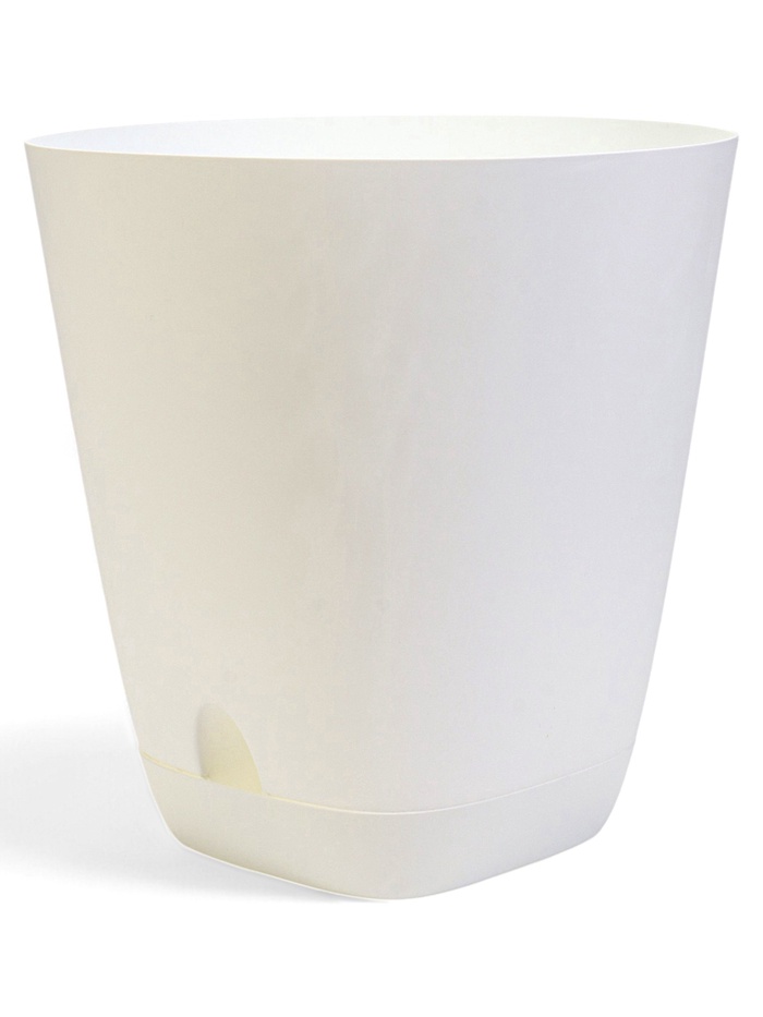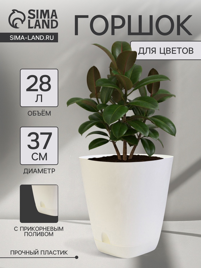 Белый пластиковый горшок для цветов «Гранд» максимального объема с системой прикорневого полива. Профессиональное решение для крупных комнатных растений. Объем 28 литров, диаметр 37 см, высота 38 см. В комплекте съемный поддон.