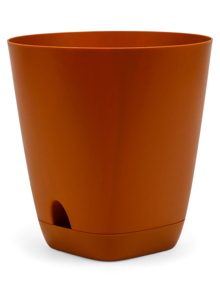 Коричневый пластиковый горшок для цветов «Гранд» увеличенного объема с системой прикорневого полива. Солидное настольное решение для растений. Объем 4 литра, диаметр 19 см, высота 20 см. Комплектуется встроенным поддоном.
