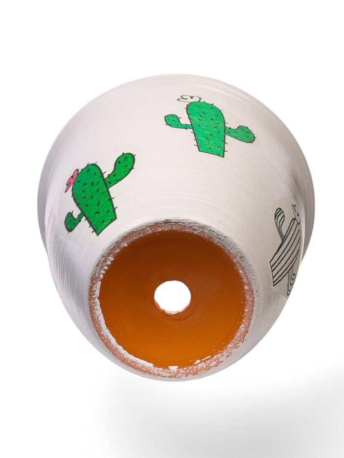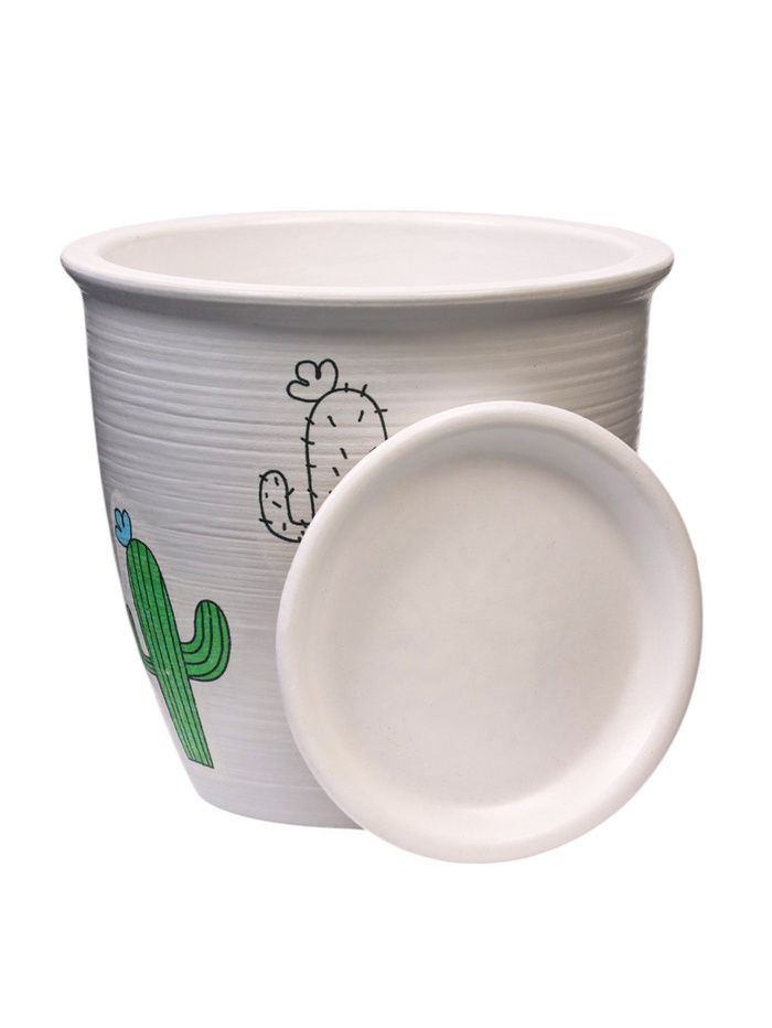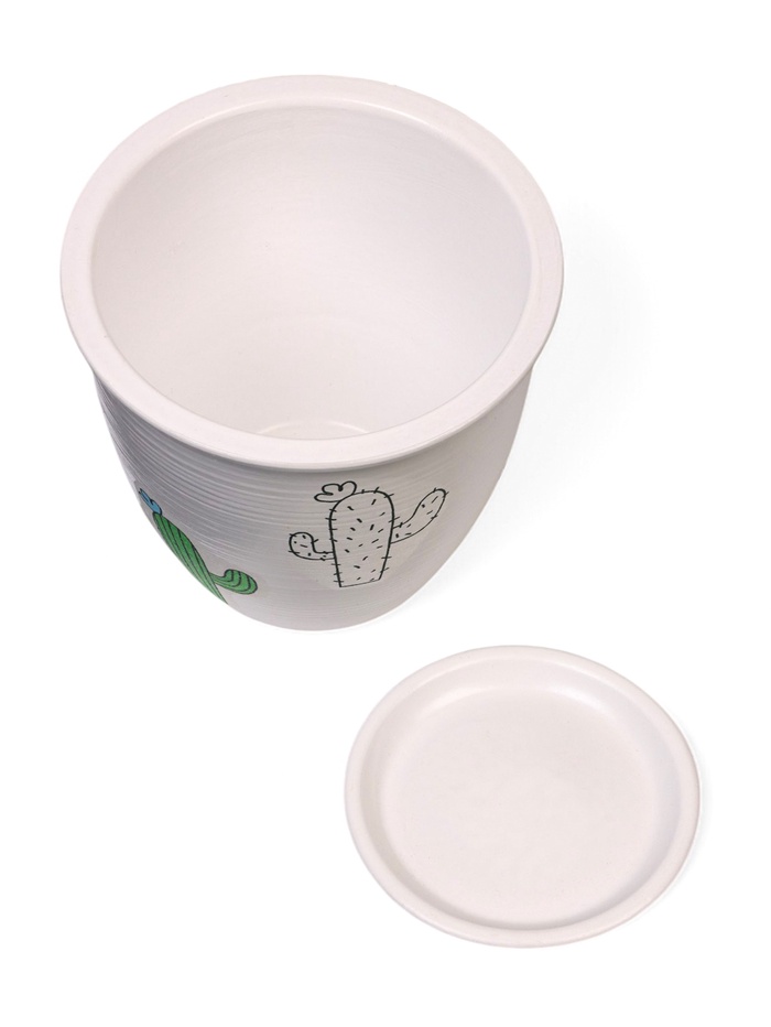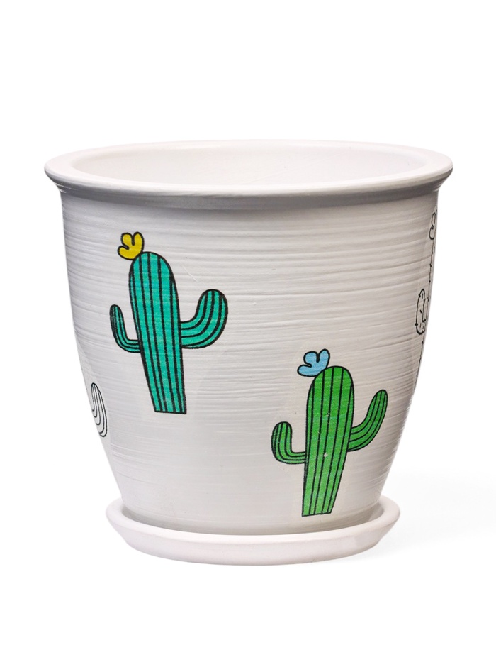 - Милый дизайн: белый цвет гарантирует, что горшок отлично подойдёт почти под любой стиль. А милый узор с кактусом выделит его на фоне других деталей интерьера.
