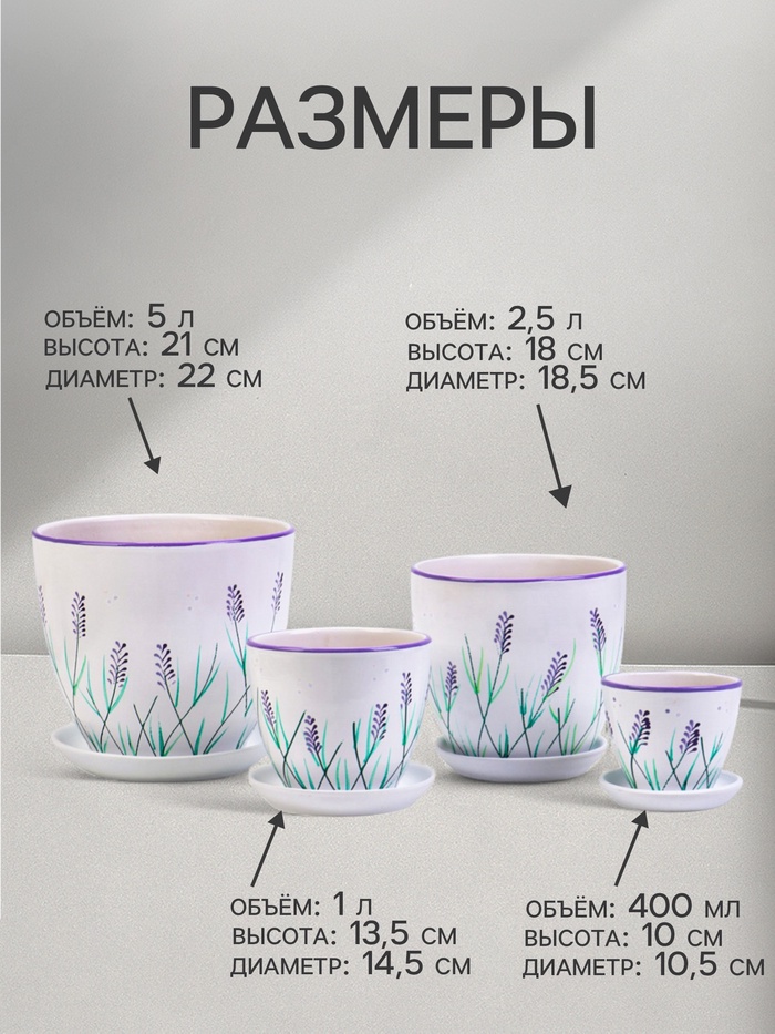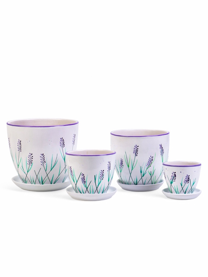 Набор керамических горшков «Лаванда» в нежном белом цвете — элегантное решение для вашего домашнего сада. В комплекте 4 горшка разных объёмов (0.4 л, 1 л, 2.5 л, 5 л), выполненных из качественной керамики. Идеально подходят для размещения на подоконниках, столах и полках. Каждый горшок снабжён поддоном, что обеспечивает защиту поверхностей от излишков воды.