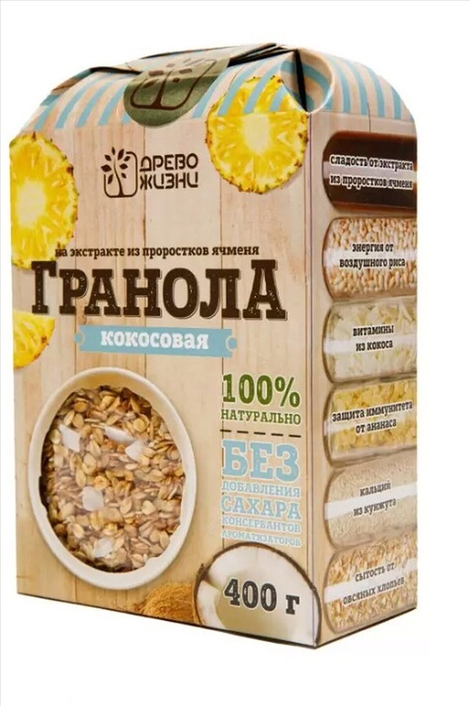 Состав: овсяные хлопья, экстракт из проростков ячменя, ананас сушеный, сироп топинамбура, кокосовое масло рафинированное, воздушный рис, семена кунжута белого, кокосовые хлопья (высушенная мякоть кокоса)