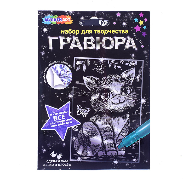 • В наборе: - основа с нанесённым контуром рисунка (10х15 см.) - штихель. - палочка-скребок. • Соответствует требованиям безопасности продукции. • Для детей от 3-х лет.