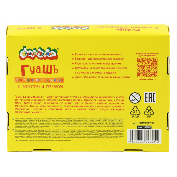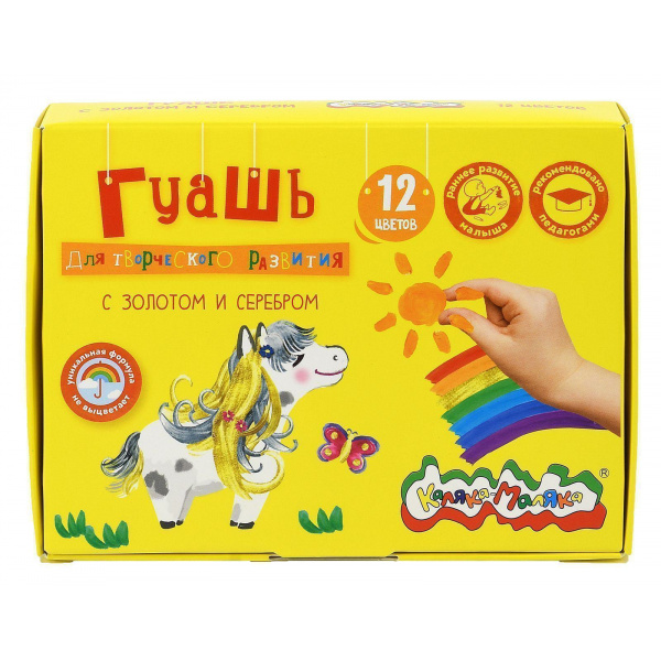 Гуашь Каляка-Маляка® имеет оптимальное цветовое сочетание и обладает хорошей насыщенностью. Цвета гуаши соответствуют естественным цветам природы. Это положительно влияет на формирование у ребенка правильного цветового восприятия и на развитие его творческих способностей.