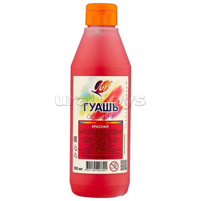 Гуашь предназначена для выполнения художественно-декоративных и оформительских работ. Обладает превосходной кроющей способностью, насыщенностью и чистотой цвета, равномерно наносится. После высыхания краски поверхность становится матово-бархатистой. • Цвет: красный. • Объём: 500 мл. • Состав: вода питьевая, декстрин, глицерин, пигменты, наполнители, консервант. • Тара: пластиковая бутылка с крышкой-дозатором. • Соответствует требованиям безопасности и стандартам качества продукции. • Для детей от 3-х лет.