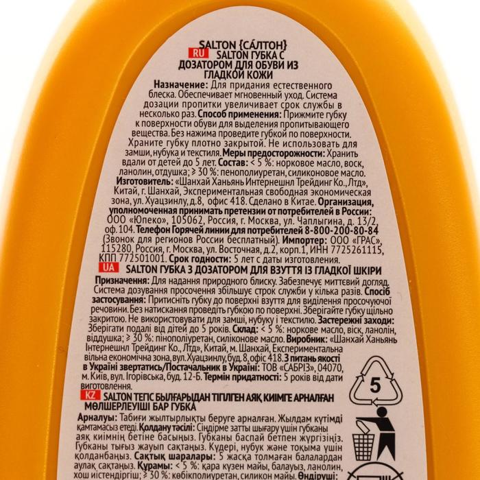 Благодаря инновационной Технологии All-Day-Effect Губки с дозатором SALTON поддерживают ухоженный вид обуви в течение всего дня: очищают от пыли, загрязнений и придают естественный блеск.