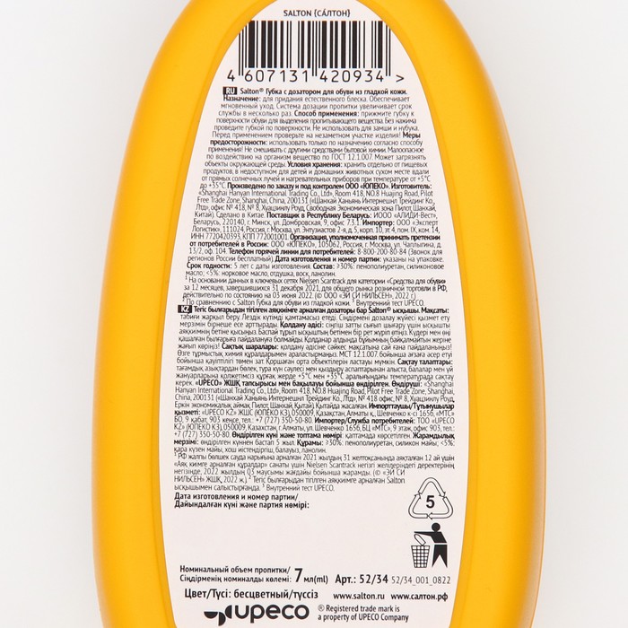 Способ применения: снимите крышку, прижмите губку к поверхности обуви для выделения пропитывающего состава. Без нажима проведите Губкой по поверхности. После использования закройте крышку, храните Губку плотно закрытой. Не использовать для замши, нубука или ткани.
