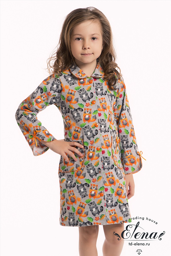 Халат для девочки выполнен из хлопкового полотна с начёсом. Горловина оформлена воротником, центральная застёжка на пуговицы. Рукава и карманы халата украшены бантиками.