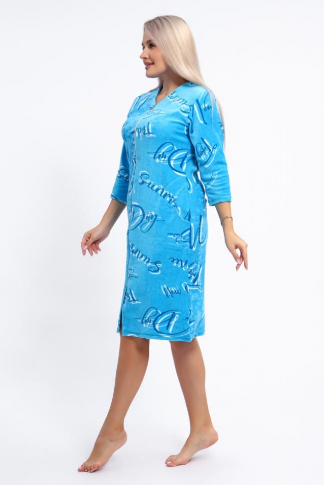 Халат женский на молнии из набивного велюра полуприлегающего силуэта. Горловина халата имеет V-образный вырез, обработана обтачкой, рукав 3/4, карманы. Халат прекрасно подойдет для дома и отдыха.