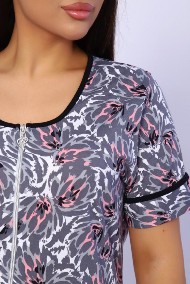 Халат женский на молнии оригинальной расцветки выполнен из кулирки 100% хлопок. Горловина, карманы и рукава отделаны контрастным кантом, по бокам разрезы с закруглением. Халатик идеально подойдет для дома и отдыха.