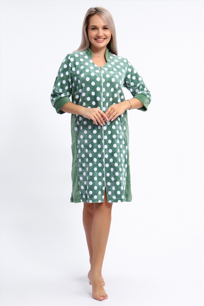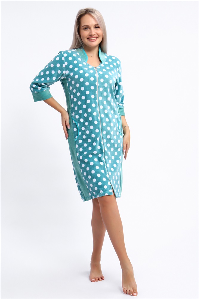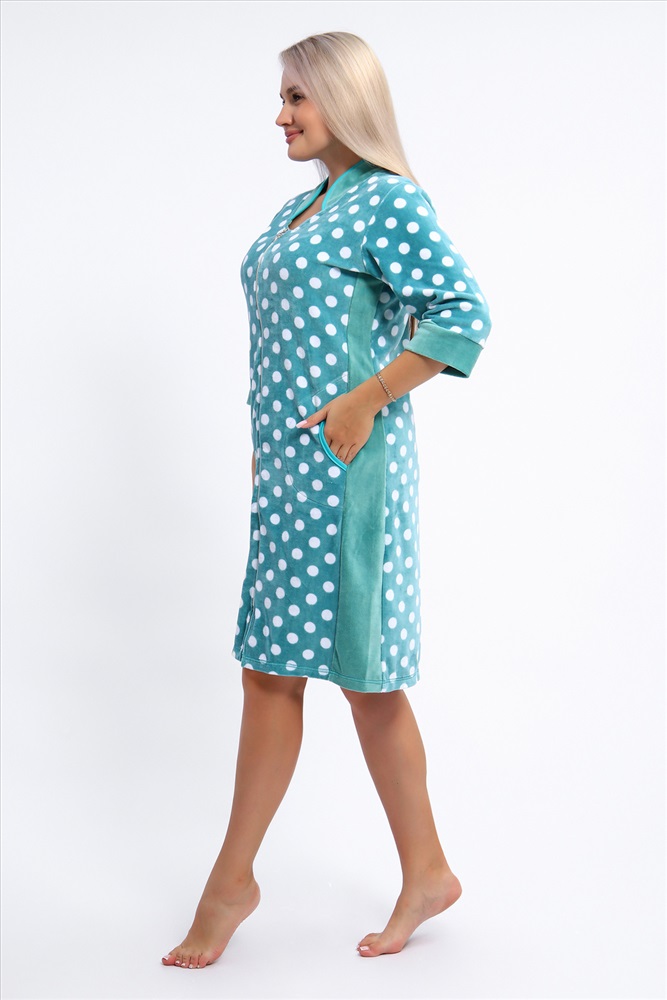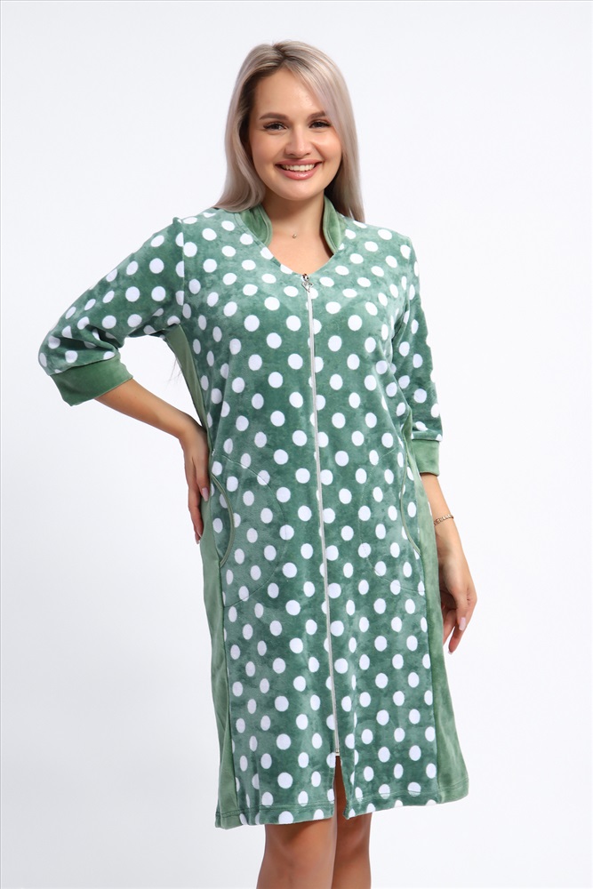 Халат велюровый на молнии в горошек. Воротник-стойка, рукава 3/4 на манжете, по бокам однотонная вставка, с карманами. Ткань велюр, качество отличное, после стирки цвет не теряет, не деформируется, приятное к телу. Для дома и отдыха.