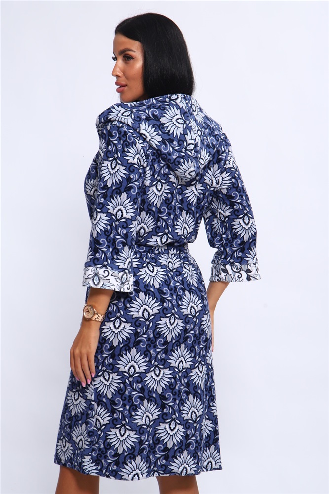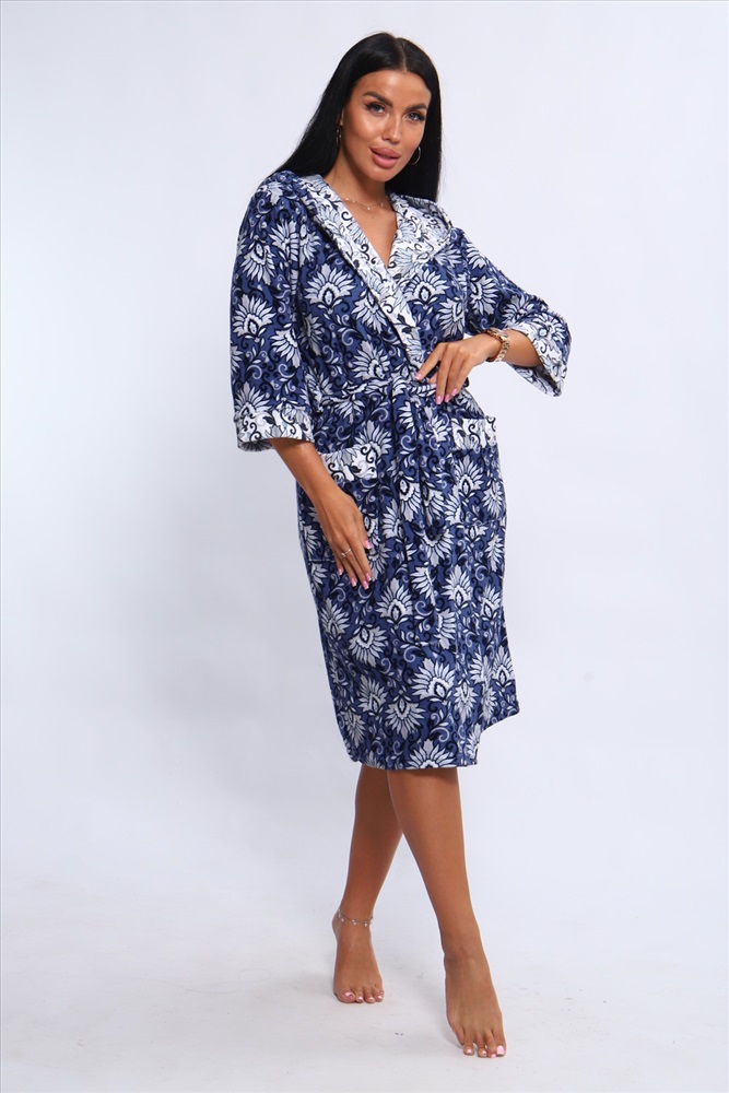 Стиль: домашний Халат женский из махры в приятном цвете. Халат с капюшоном и карманами. Халат на запах с поясом. Выполнен с тканью компаньон. Комфортный, средней длины.