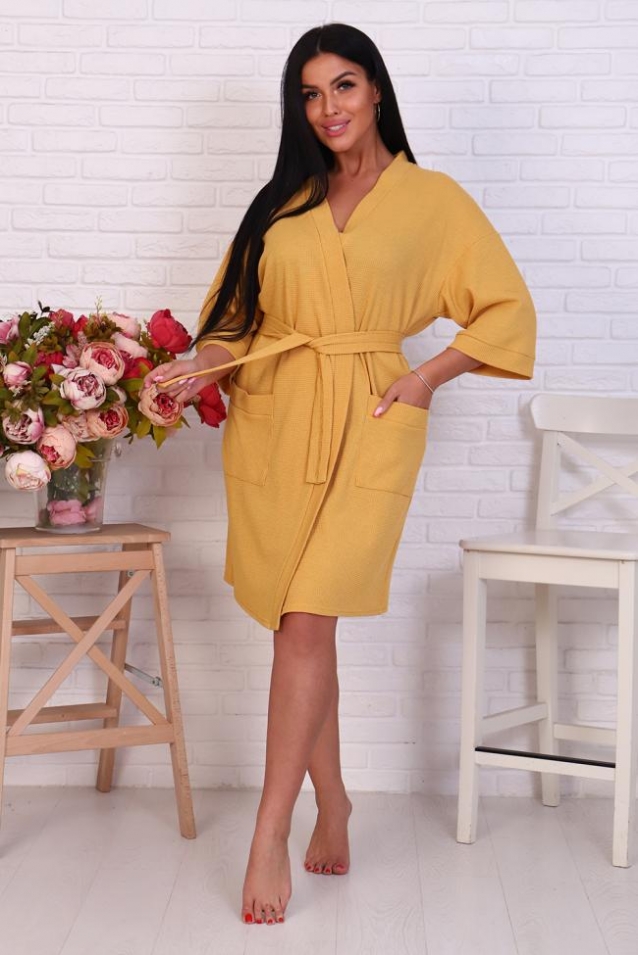 Халат женский из трикотажного полотна СОТЫ. Модель свободного кроя, запашной на широкой планке с поясом, спущенная пройма, широкий 3/4 рукав на манжете, удобные накладные карманы. Домашний халатик - это уютная, приятная к телу, практически незаменимая вещь в гардеробе женщины любого возраста. Трикотаж СОТЫ или стрейч СОТЫ полностью соответствует названию. Оригинальный набивной рисунок, образованный переплетением волокон, внешне напоминает пчелиные соты. Полотно мягкое, эластичное и прочное, легко стирается, практически не мнется, не деформируется.