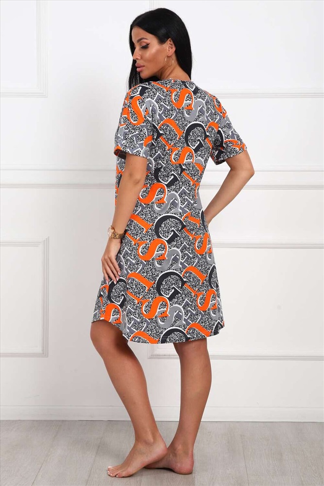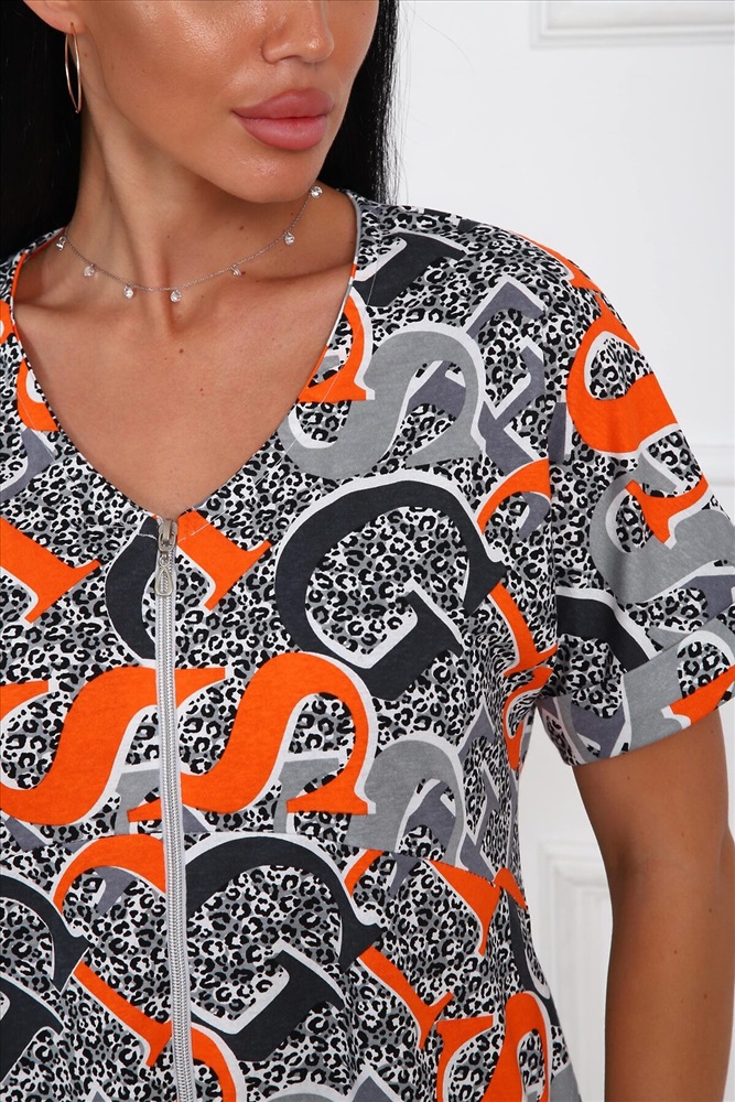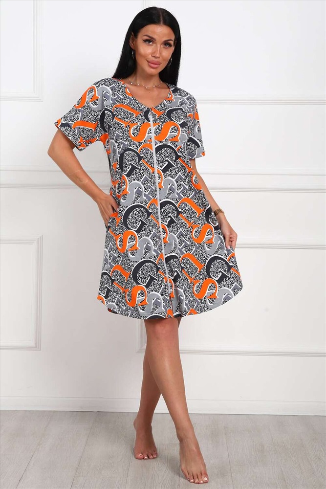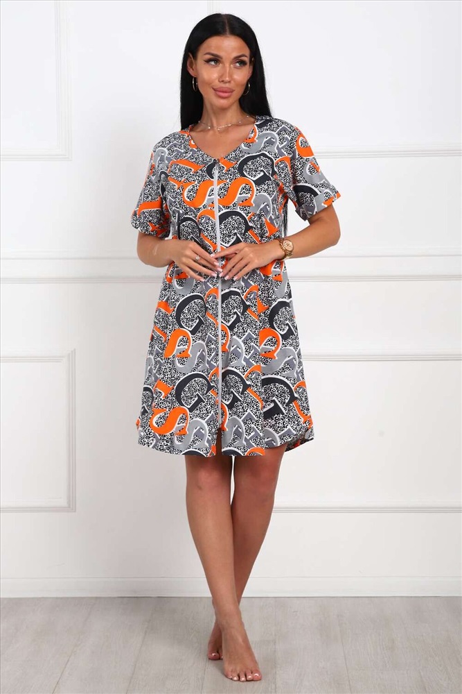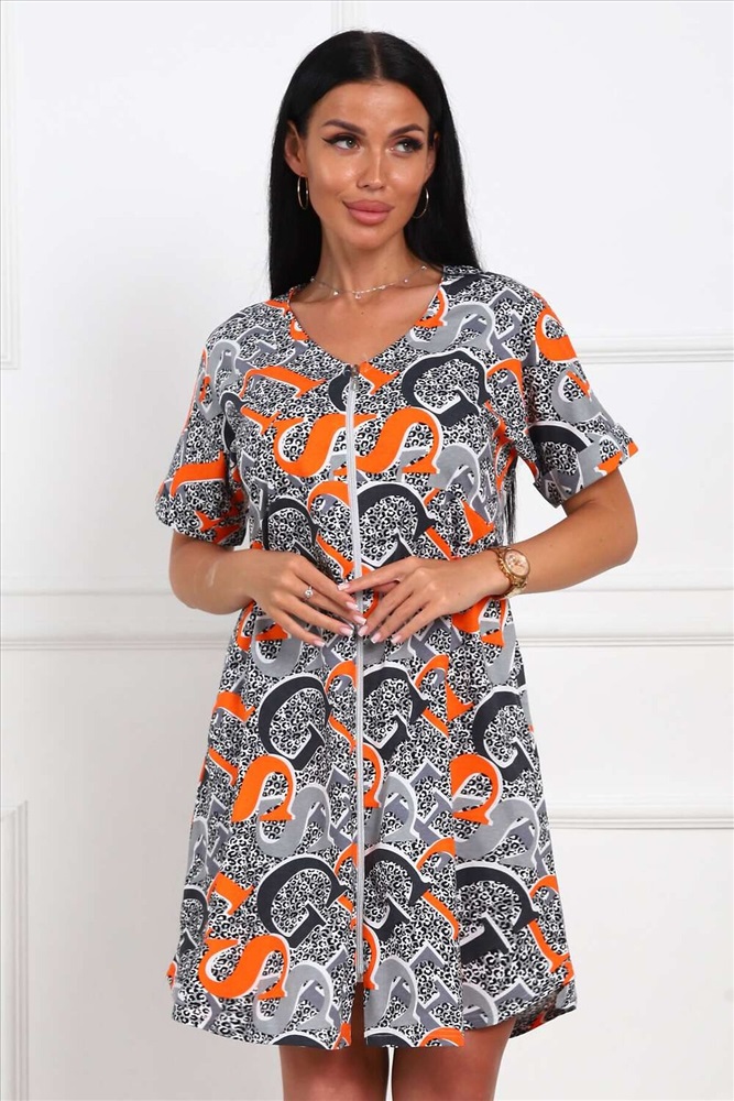 ID товара: 1136039 Состав: Хлопок 100% Сезон: Демисезон Длина: До колена Фасон: Полуприлегающий Рукав: короткие Вид застежки: Молния Декоративные элементы: Принт Основная ткань: Хлопок Вид ткани: Кулирка Страна бренда: Россия Страна производства: Россия Халат женский из натурального трикотажа. Хлопок 100%, Силуэт полуприлегающий, раклешеный к низу. Горловина V-образная. Линия плеч спущена. В боковых швах карманы. Низ изделия фигурный. Застежка на тесьму молнию. На полочке и спинке фигурные подрезы. Комментарии к товару