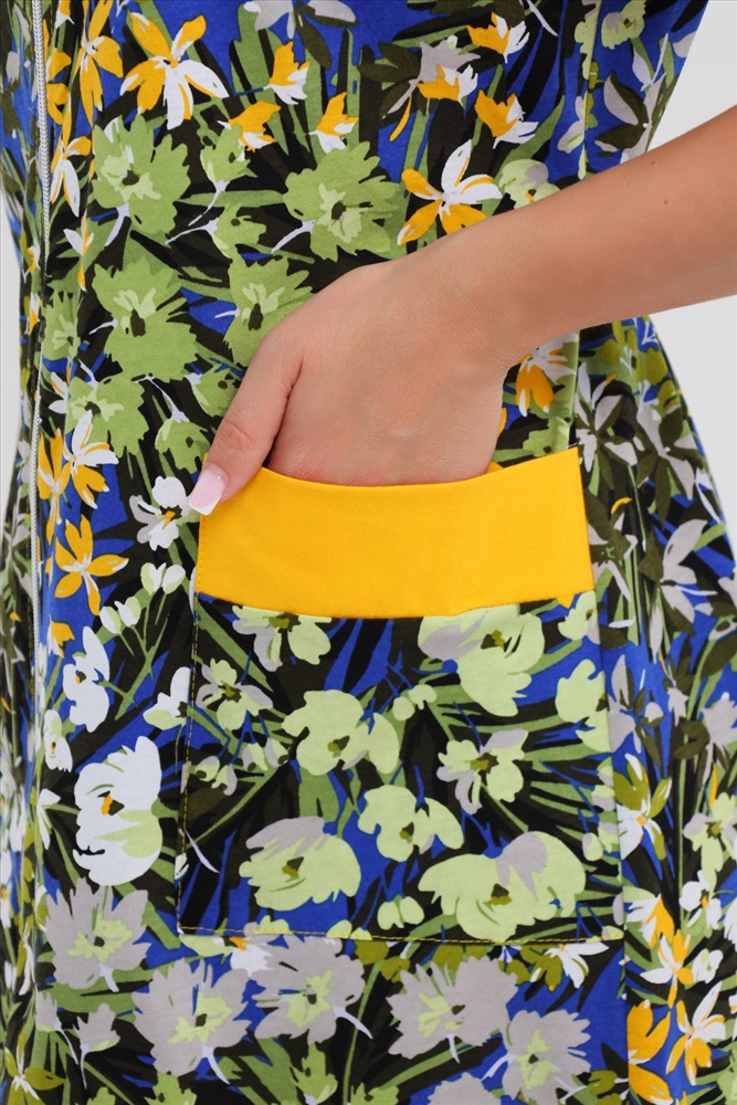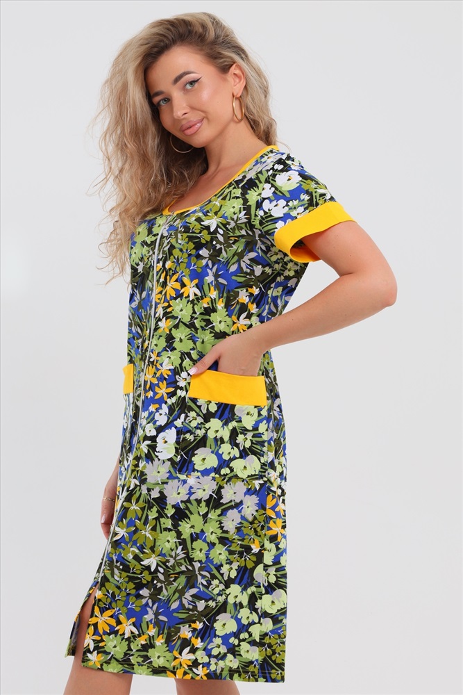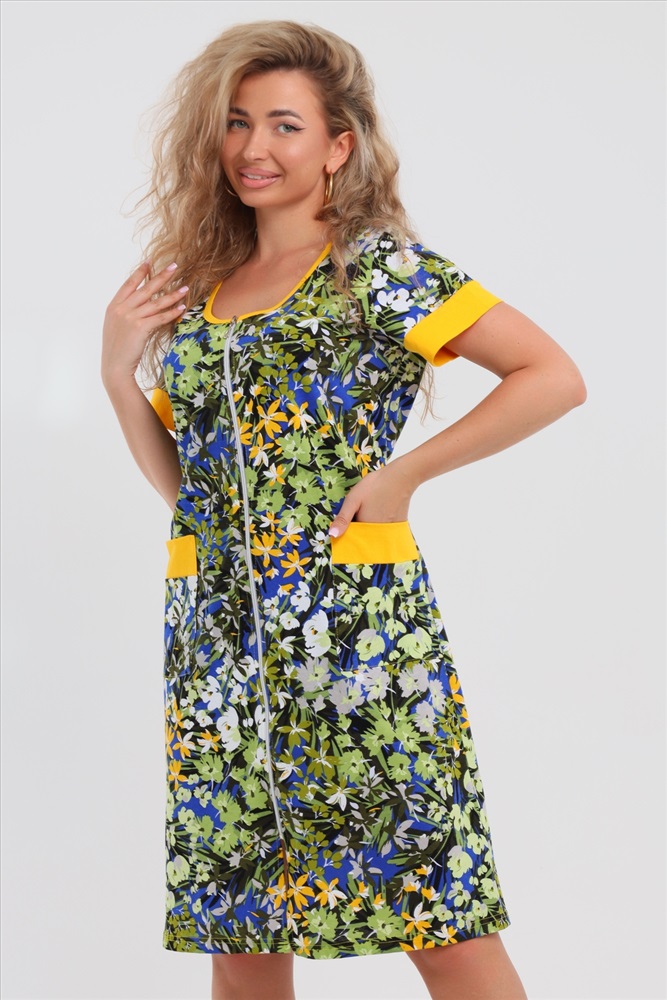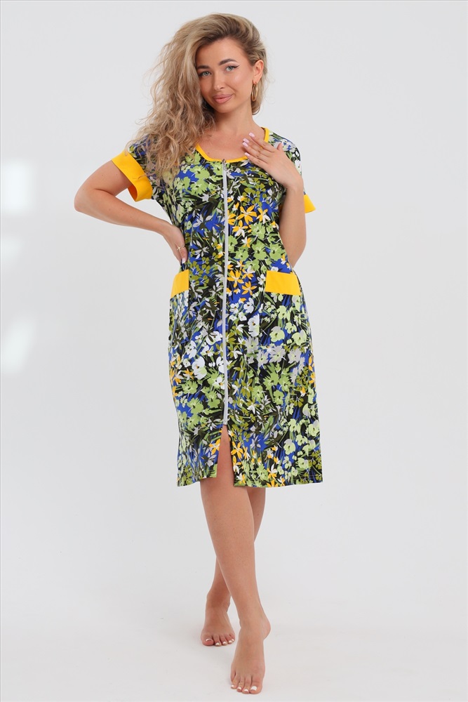 Женский халатик на молнии самая распространенная и универсальная одежда для домашнего отдыха и хозяйственных хлопот. После трудного рабочего дня, приходя домой, первым делом хочется переодеться. И данная модель это идеальный вариант среди представительниц прекрасной половины человечества. Модель выполнена из 100% хлопчатобумажной ткани. Халат так же дополняет яркая отделка по рукавам и карманам. А пояс на линии талии поможет легко смоделировать женственный силуэт и при этом Вы будете чувствовать себя легко и непринуждённо. Данная модель прекрасно подойдёт для дома, дачи и отдыха, создавая по-настоящему яркий образ и хорошее настроение! Рост модели на фото 165см.