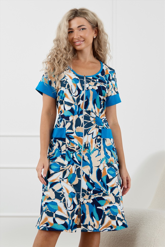 Женский халатик на молнии самая распространенная и универсальная одежда для домашнего отдыха и хозяйственных хлопот. После трудного рабочего дня, приходя домой, первым делом хочется переодеться. И данная модель это идеальный вариант среди представительниц прекрасной половины человечества. Модель выполнена из 100% хлопчатобумажной ткани. Халат так же дополняет яркая отделка по рукавам и карманам. А пояс на линии талии поможет легко смоделировать женственный силуэт и при этом Вы будете чувствовать себя легко и непринуждённо. Данная модель прекрасно подойдёт для дома, дачи и отдыха, создавая по-настоящему яркий образ и хорошее настроение! Рост модели на фото 165см.