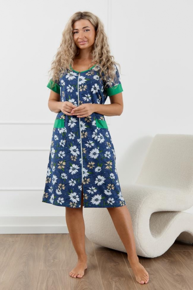 Женский халатик на молнии самая распространенная и универсальная одежда для домашнего отдыха и хозяйственных хлопот. После трудного рабочего дня, приходя домой, первым делом хочется переодеться. И данная модель это идеальный вариант среди представительниц прекрасной половины человечества. Модель выполнена из 100% хлопчатобумажной ткани. Халат так же дополняет яркая отделка по рукавам и карманам. А пояс на линии талии поможет легко смоделировать женственный силуэт и при этом Вы будете чувствовать себя легко и непринуждённо. Данная модель прекрасно подойдёт для дома, дачи и отдыха, создавая по-настоящему яркий образ и хорошее настроение! Рост модели на фото 165см.