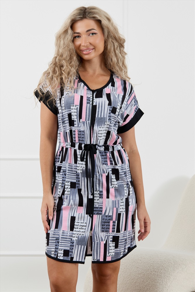 Состав: 100% хлопок Модель: Халат 36984 Тип товара: халат Материал: кулирка | кулирка Бренд: Натали Суслова Карман: боковые Назначение: для дома Отделка: с карманами | с поясом | со шнурком Рисунок: геометрия Рукав: короткий рукав Сезонность: лето | осень | весна | зима Силуэт: свободный Стиль: домашний Воротник: без воротника Застежка: молния Женский трикотажный халат на молнии без сомнения станет самой желанной и любимой вещью в гардеробе любой дамы. Халатик укороченный, на кулисе со шнурком, с удобными карманами и молнией. Выглядит стильно и современно. Халатик такого плана подходит для фигур разного типа. Легкий и мягкий, качественный, дышащий, сшит из высококачественного трикотажа, подарит вам абсолютную непринужденность и легкость, простор в движении, идеально подойдет для беременных и кормящих и будет хорошим сопровождением в роддом и не вызовет раздражения, так как создан из натуральной ткани. Благодаря этому может стать прекрасным подарком для, мамы, подруги, бабушки, сестры или коллеги на любой праздник. Отлично сядет на женщин больших размеров. Данная модель будет кстати для отдыха на даче и даже поездки к морю. Домашняя одежда российского производства, имеет комфортную посадку, не линяет, не дает усадку после стирки и долго сохраняет первоначальный внешний вид. Халатик подчеркнет Ваш стиль и добавит молодежных нот в ваш образ, а затягивающийся пояс на талии придаст женственности и изящества вашему луку. Стирайте изделия из хлопка на бережном режиме с температурой не выше 30С, чтобы сохранить цвет, форму и фактуру материала. Приобретая наши изделия, радуйте себя и своих близких. Ориентируясь по таблице замеров, обратите внимание, что замеры длины рукава проводились от точки основания шеи. Таблица размеров и веса