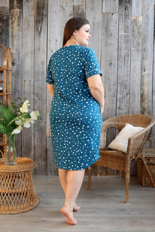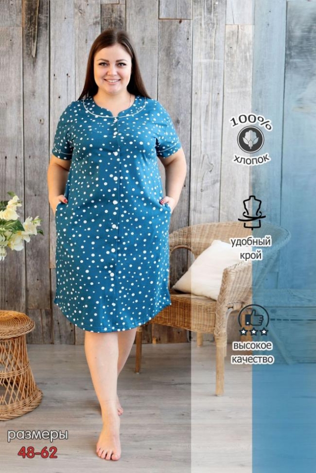 На модели размер 52 Халат на пуговицах со спущенной проймой, горловина и короткий рукав отделаны кантом, как и вход в боковой карман. Средней длины ниже колена. На модели размер 52