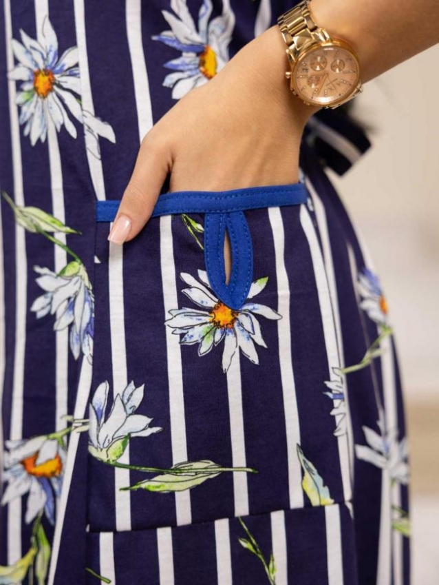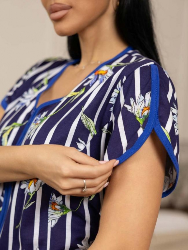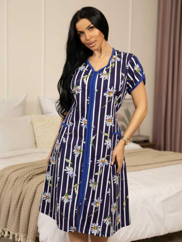 Женский домашний халат из хлопка, полуприлегающего силуэта с застежкой на молнию. Спереди на халате рельефные швы и два накладных кармана. Сзади пояс, обеспечивающий прилегание по спинке и создающий силуэт песочные часы.