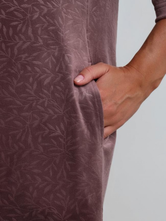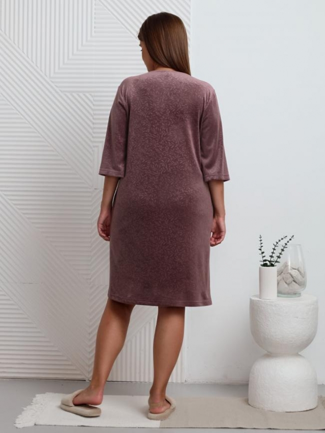 Халат женский из гладкокрашеного полотна «велюр» с рисунком, выполненным тиснением на термопрессе. Изделие прямого силуэта, с втачными рукавами длиной ¾, горловиной овальной формы, карманами в боковых швах и центральной бортовой застежкой на тесьму «молния».