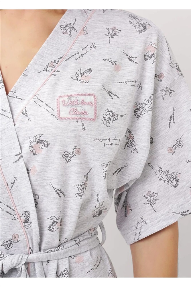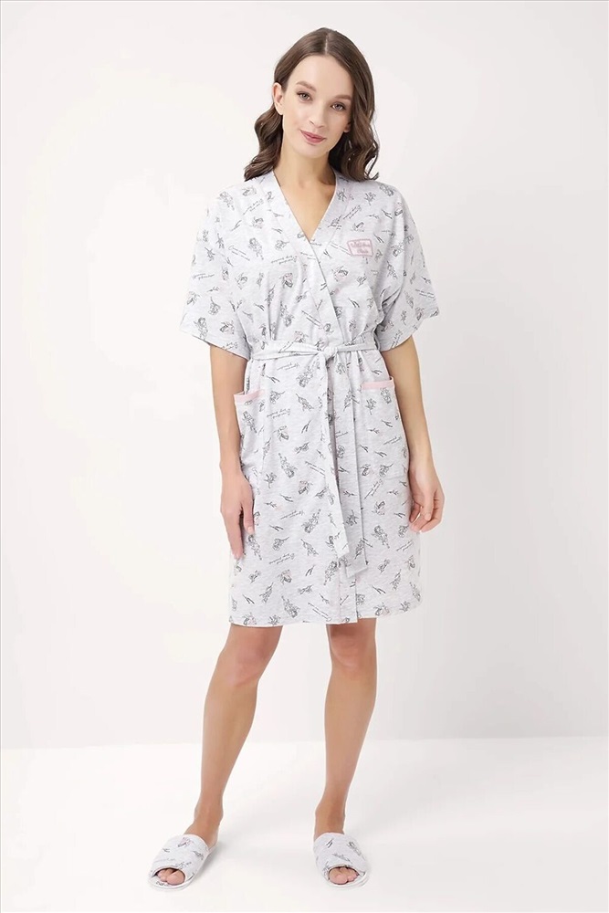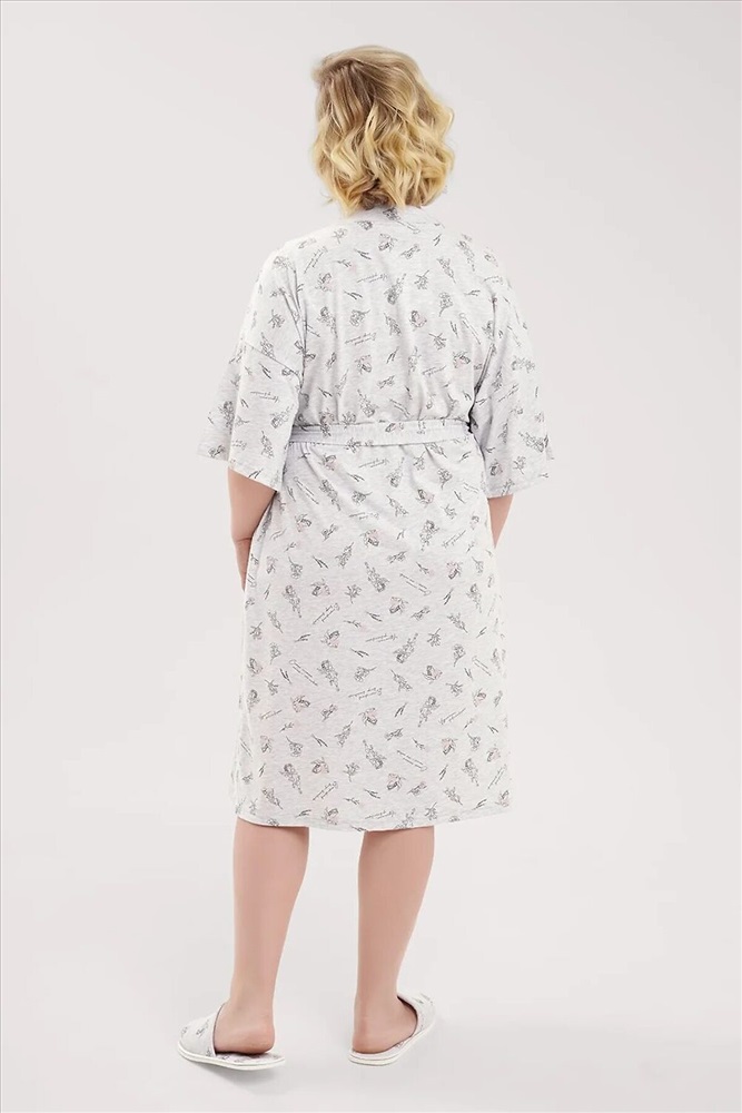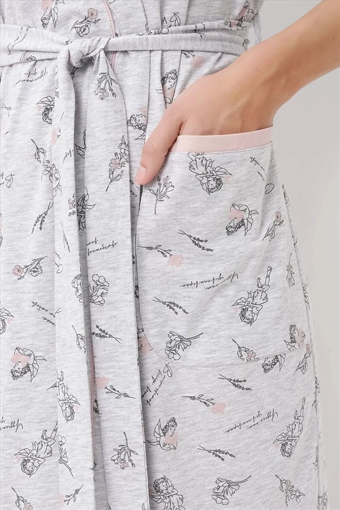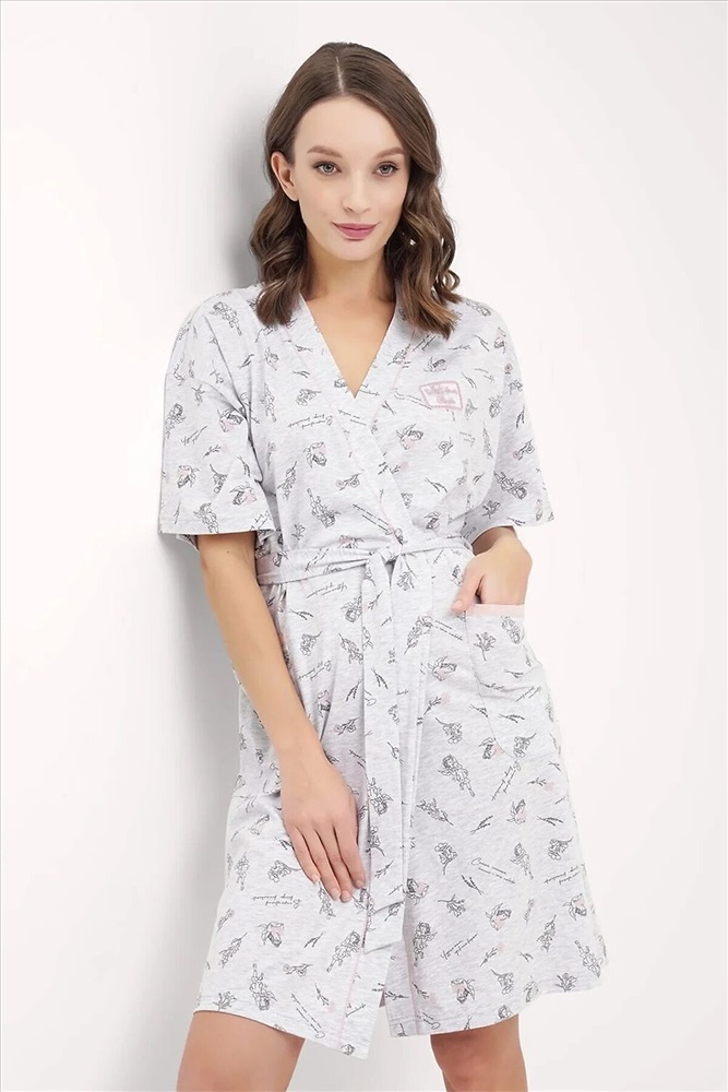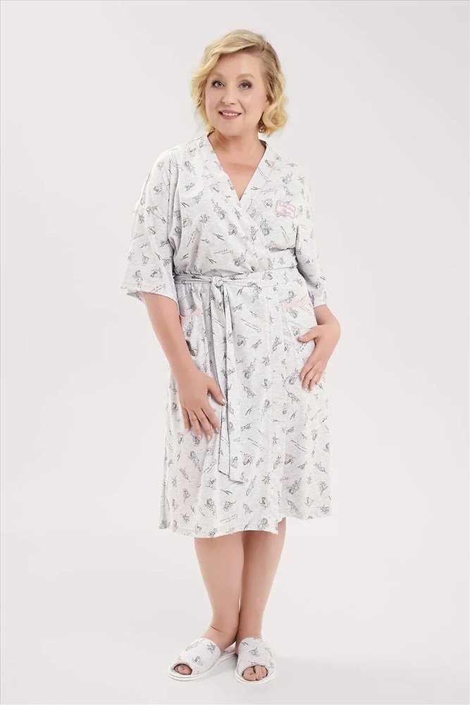 Халат из хлопкового трикотажного полотна на запах. По борту обтачка с контрастным кантом. По талии съёмный пояс, внутренние завязки. Накладные карманы с контрастной обтачкой. Спущенная линия плеча с рукавом длиной 3/4. Спереди ажурная нашивка.