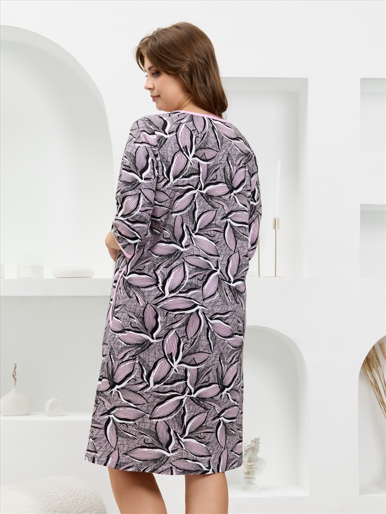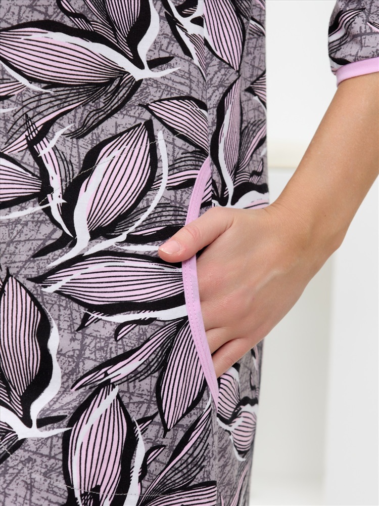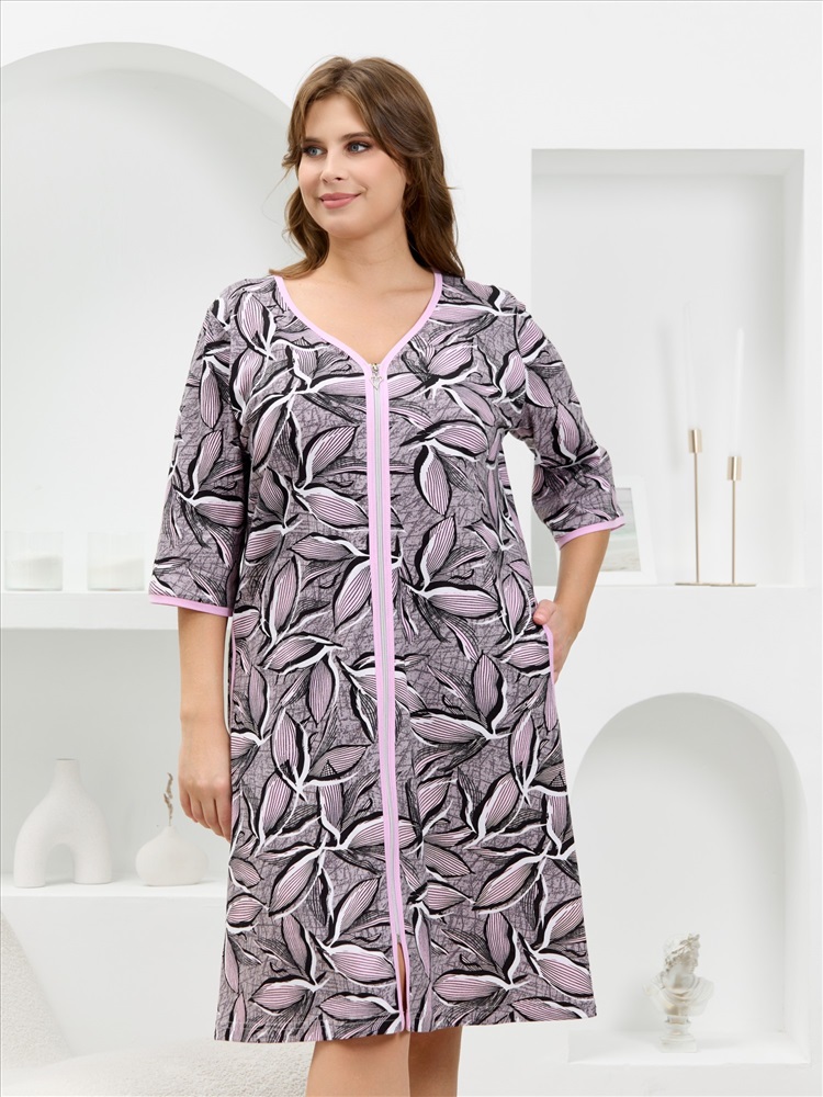 Состав: 100% хлопок Ткань: Кулирка Кулирка - это самое гладкое и тонкое трикотажное полотно из чистого хлопка. С лицевой стороны ткань «кулирка» выглядит как «вертикальные косички», орнамент изнаночной стороны напоминает «кирпичную кладку». Свойства кулирного трикотажа- воздухопроницаемость, гигроскопичность, не теряя своей формы, практически не тянется в длину и хорошо растягивается в ширину, не образует складки. Халат женский из трикотажного полотна «кулирка» с набивным рисунком, прямого силуэта, с короткими втачными рукавами, горловиной овальной формы, карманами в боковых швах и центральной бортовой застежкой на тесьму «молния». Бортовые срезы, горловина и входы в карманы окантованы контрастным материалом.