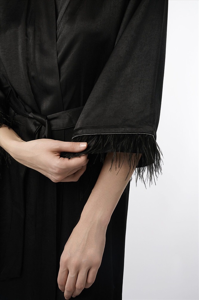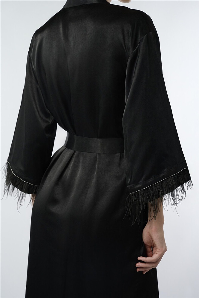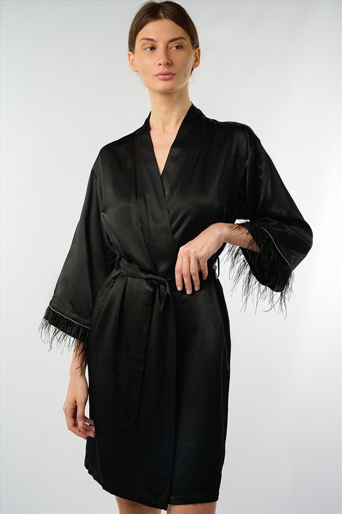 Страна производства: Китай Женский халат 5197SYC изготовлен из вискозы с добавлением полиэстера, благодаря чему ткань легкая и приятная на ощупь.Качественный смесовый материал устойчив к износу, не теряет внешний вид после стирки. Модель выполнена в черном цвете с изысканными перьями на рукавах.Изделие имеет классический V-образный вырез и пояс-завязку на талии для удобной фиксации. Идеально подходит для домашнего использования и создает ощущение уюта и комфорта.