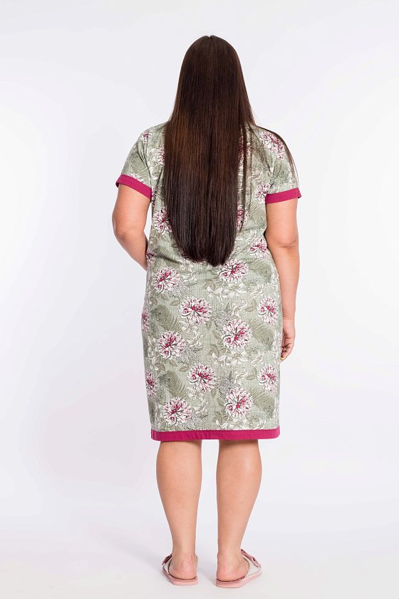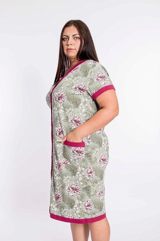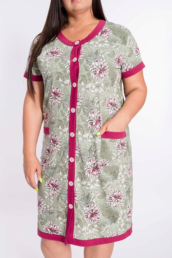Женский халат на пуговицах выполнен из набивной хлопковой ткани. Рукава короткие, спереди расположены карманы. В качестве отделки на карманах, горловине, рукавах, низу и бортам халата использована широкая бейка из однотонного полотна.