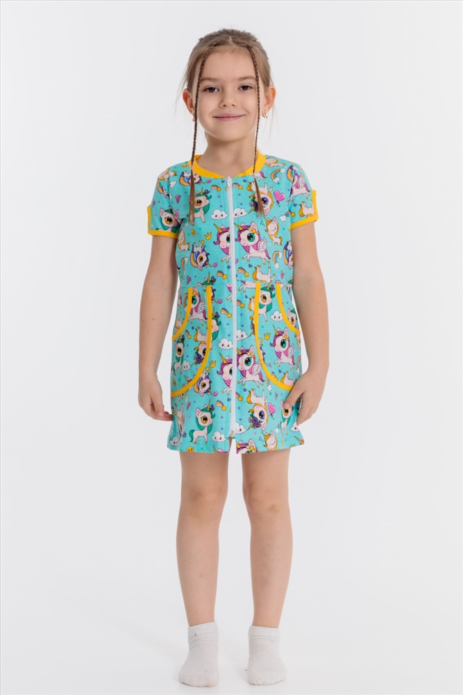 Тип длинны (для платьев): Мини Вид ткани: Кулирка Застежка: Молния С карманами: Да Сезон: Всесезонный Состав: Хлопок 100% Цвет Номенклатуры: ментол Халат для девочек выполнен из хлопковой ткани с набивным рисунком. С карманами и центральной застёжкой на молнию спереди. Короткие рукава с декоративными элементами. Детали халата обработаны бейкой контрастного цвета. ВНИМАНИЕ !!! На данную модель нет гарантии по цвету. Расцветка набивки может отличаться от представленной на фото. Комментарии к товару