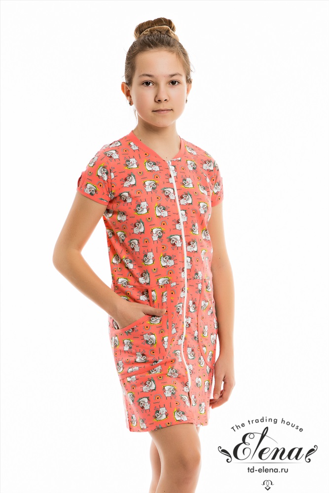 Тип длинны (для платьев): Мини Вид ткани: Кулирка Застежка: Молния С карманами: Да Сезон: Всесезонный Состав: Хлопок 100% Цвет Номенклатуры: светло-красный Халат для девочек выполнен из хлопковой ткани с набивным рисунком. С карманами и центральной застёжкой на молнию спереди. Короткие рукава с декоративными элементами. Детали халата обработаны бейкой контрастного цвета. ВНИМАНИЕ !!! На данную модель нет гарантии по цвету. Расцветка набивки может отличаться от представленной на фото. Комментарии к товару